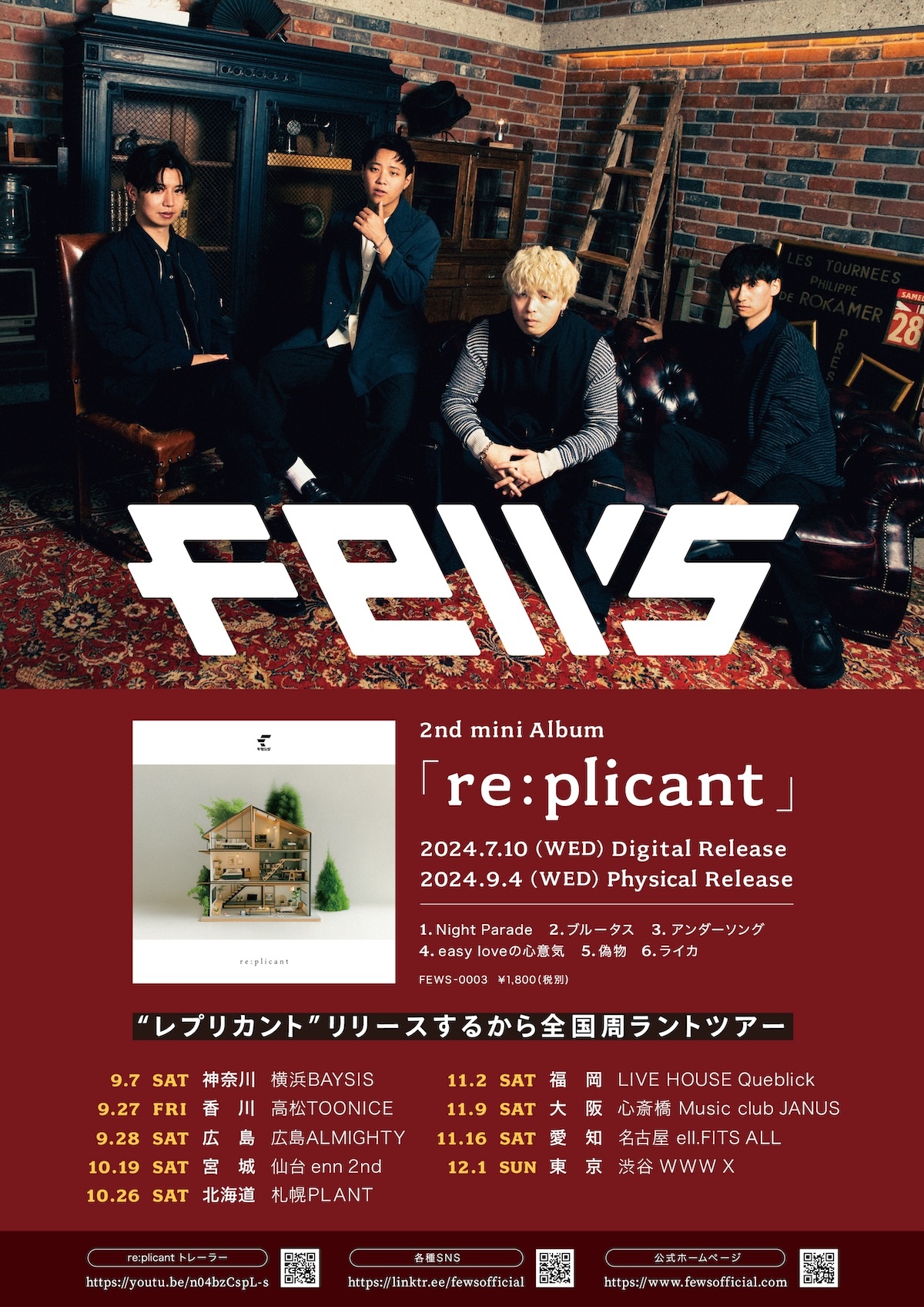 先日結成1周年を迎えたfews(ex.ドラマストア / ウソツキ)が、2nd mini Album『re:plicant』(読み:レプリカント)のリリースと全国ツアー開催を発表した。