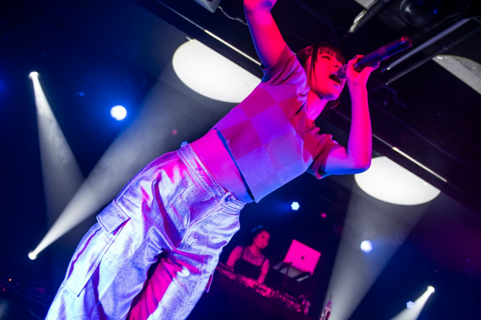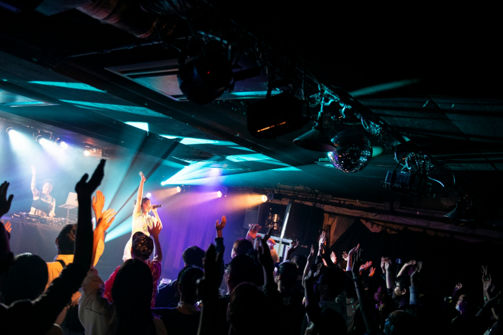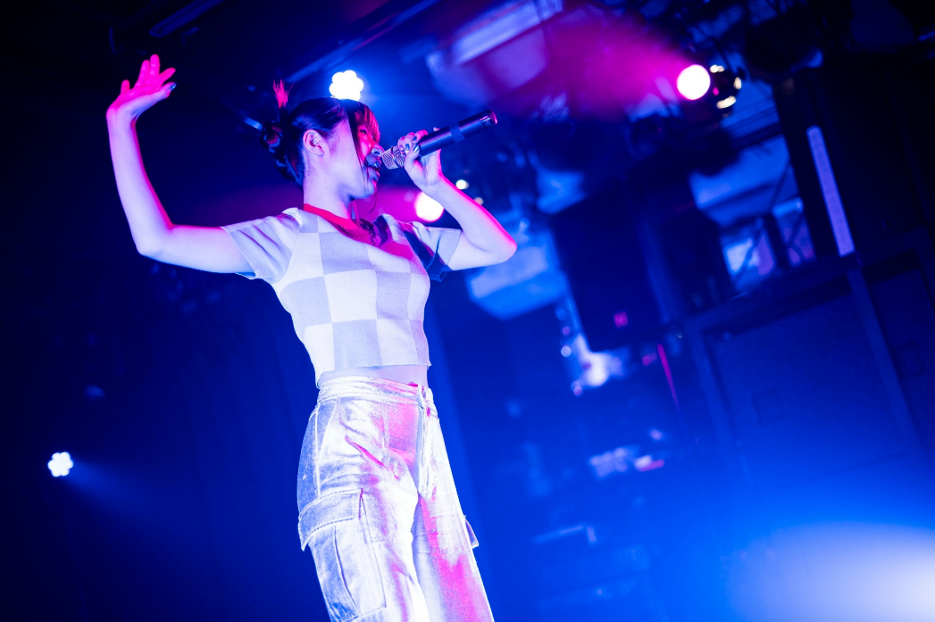 続けて「BaNe BaNe feat. DOTAMA」を披露し、先ほどとはうって変わって会場が一気にドリーミーな#KT劇場へ。4曲目の「ぴーおーぴー」では、曲途中で自らトラックを止め、アーティスト活動への決意のこもったアカペララップを披露すると、フロアからは大きな拍手が巻き起こった。#KTちゃんの地元である「夜の横浜」をイメージ した5曲目「PIKA PIKA」では、#KTちゃんのブレッシーな歌声とミラーボールの明かり、観客の手が合わさり会場がドリーミーなムードに包まれた。