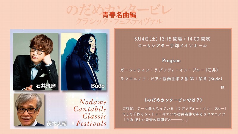 石井×茂木のコンビでの「ラプソディ・イン・ブルー」はすでにおなじみであり、茂木氏も石井琢磨のジャズ・センスを褒め称えており、名コンビ感も漂う。一方のBudoは、YouTubeのフォロワー数が10万人に近づき、8月のサントリーホール公演は完売、全国ツアーも発表するなど今乗りに乗っているが、実は協奏曲にトライするのは今回が初めて。フレッシュな演奏は、千秋真一のような若さと勢いを感じさせてくれることだろう。