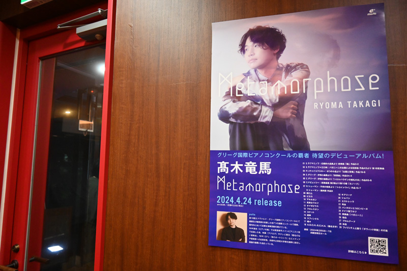 2018年に第16回エドヴァルド・グリーグ国際ピアノ・コンクールで優勝し、現在、人気若手ピアニストの一人として活躍する、髙木竜馬。デビューアルバム『Metamorphose』(メタモルフォーゼ)が2024年4月24日(水)に発売され、発売日当日には表参道カワイサロン「パウゼ」で記念イベントが開催された。「今日はお祭りのような日にしたい」という髙木の希望により、演奏やトーク以外にも髙木が催しを企画。ファーストアルバム発売を祝う楽しいひとときとなった。