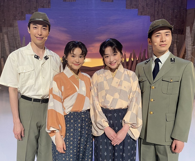 まずは、日生劇場で5月9日(木)~30日(木)まで上演される『この世界の片隅に』から主人公の浦野すずをWキャストで演じる昆夏美、大原櫻子、すずが嫁ぐ相手北條周作をWキャストで演じる海宝直人、村井良大とアンサンブルキャストが舞台扮装で出演する。