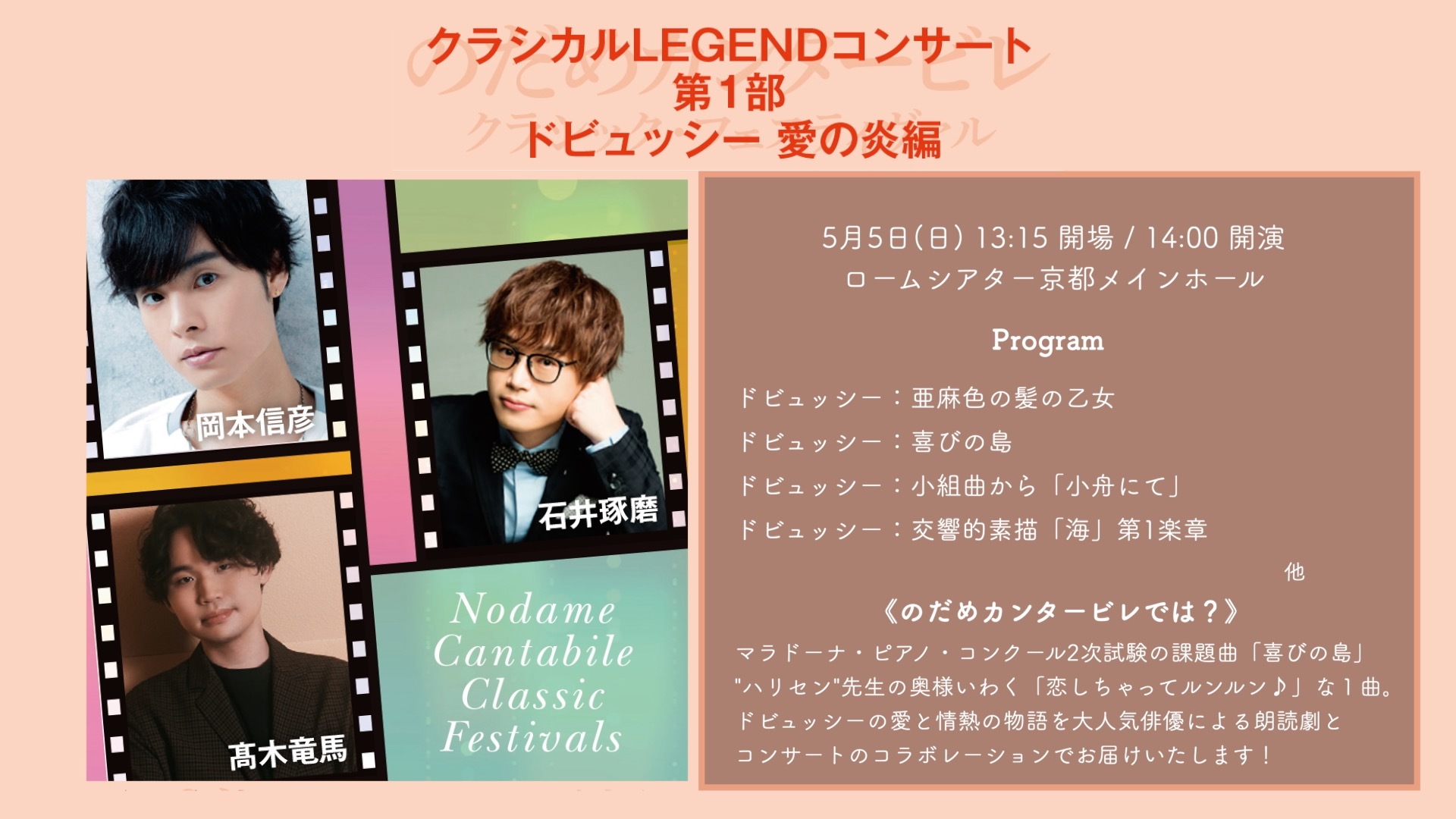 『クラシカルLEGENDコンサート 第1部ドビュッシー愛の炎編』には、人気声優の岡本信彦がストーリー・テリングを担当し、時にドビュッシーに扮する。ドビュッシーの危険な愛の逃避行が、「喜びの島」や交響的素描「海」を生み出していった事実を浮き彫りにしていく。ソロ・ピアノと2台ピアノは、石井琢磨と髙木竜馬のウィーン留学コンビの息のあった演奏が繰り広げられ、交響的素描「海」の第1楽章でドビュッシーの印象派と言われた色彩豊かなオーケストラ・サウンドを聴くことができる。