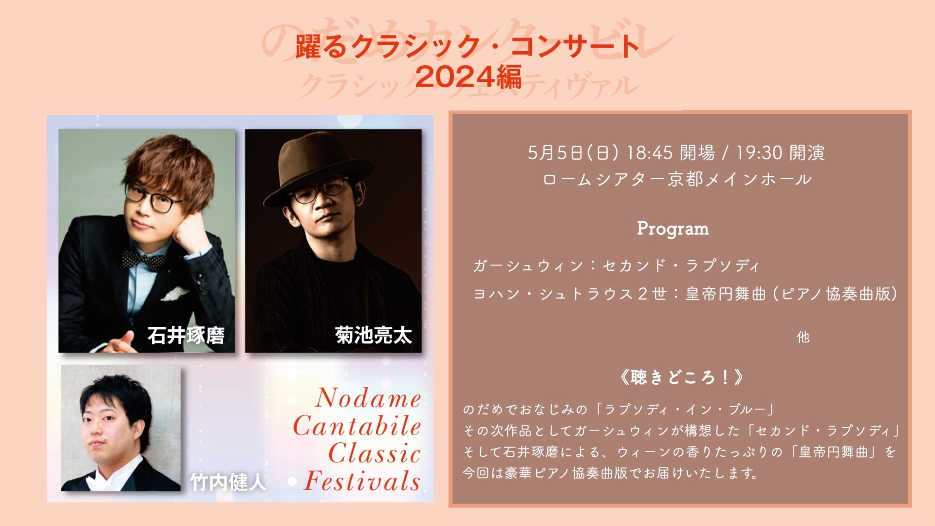 そして、メイン・ホールでフェスのラストを飾るのは、東京と大阪で人気となったピアニストの石井琢磨と菊池亮太のコンビによる『躍るクラシック・コンサート』の最新版。心躍るクラシック音楽をテーマに様々な名曲を聴かせて人気となってきたこのシリーズであるが、今回は2人が今最も演奏したい2曲にStyle KYOTO管弦楽団と新たに挑戦!菊池亮太は、ガーシュインが「ラプソディ・イン・ブルー」を超える名作とするべく世に送り出した「セカンド・ラプソディ」を演奏し、石井琢磨はここしばらく演奏してきたヨハン・シュトラウス2世の「皇帝円舞曲」をなんと新しく協奏曲形式に編曲し、今回のコンサートが初披露となる。2人のファンにとっては絶対に見逃せないコンサートとなりそうだ。