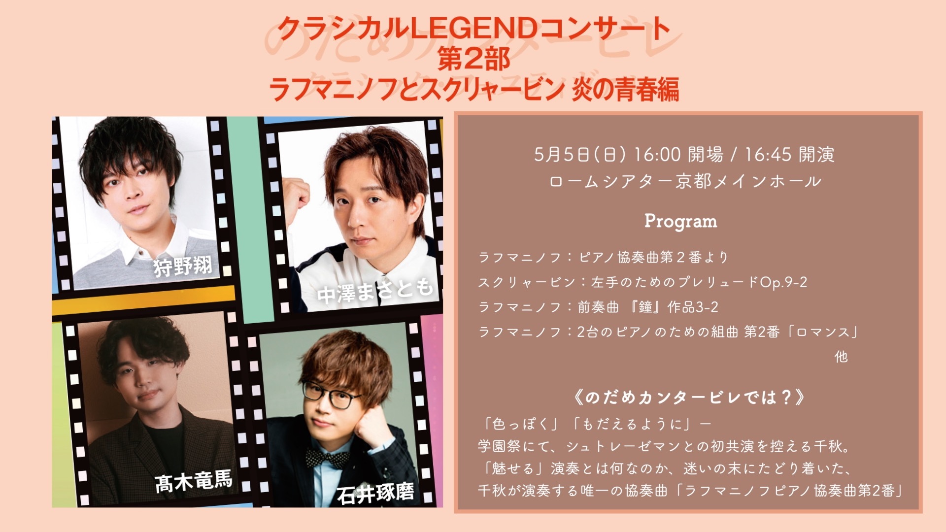 『第2部ラフマニノフとスクリャービン炎の青春編』では、同じく人気声優の狩野翔と中澤まさともが登場してスクリャービンとラフマニノフを熱演。作曲家でピアニストでもあった2人の熱い友情とライバル関係を浮き彫りにしながら、スクリャービンの左手のための作品群が生まれた背景やラフマニノフの名曲の数々が生まれた背景と音楽そのものを紹介していく。ドビュッシーの海同様、ラフマニノフの「ピアノ協奏曲第2番」第1楽章では、髙木竜馬のソロ・ピアノにあわせて、竹内健人指揮によるStyle KYOTO管弦楽団が登場する。