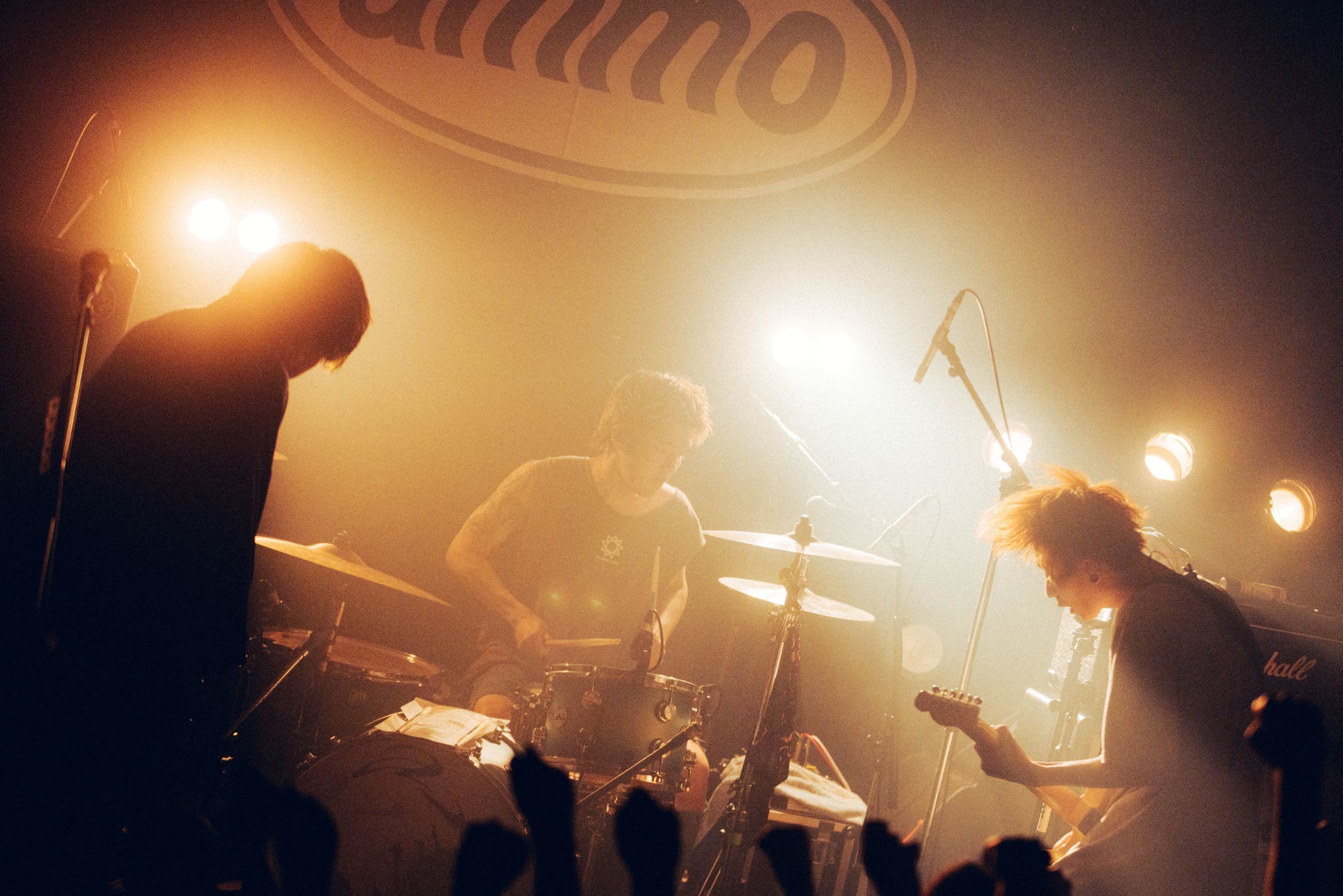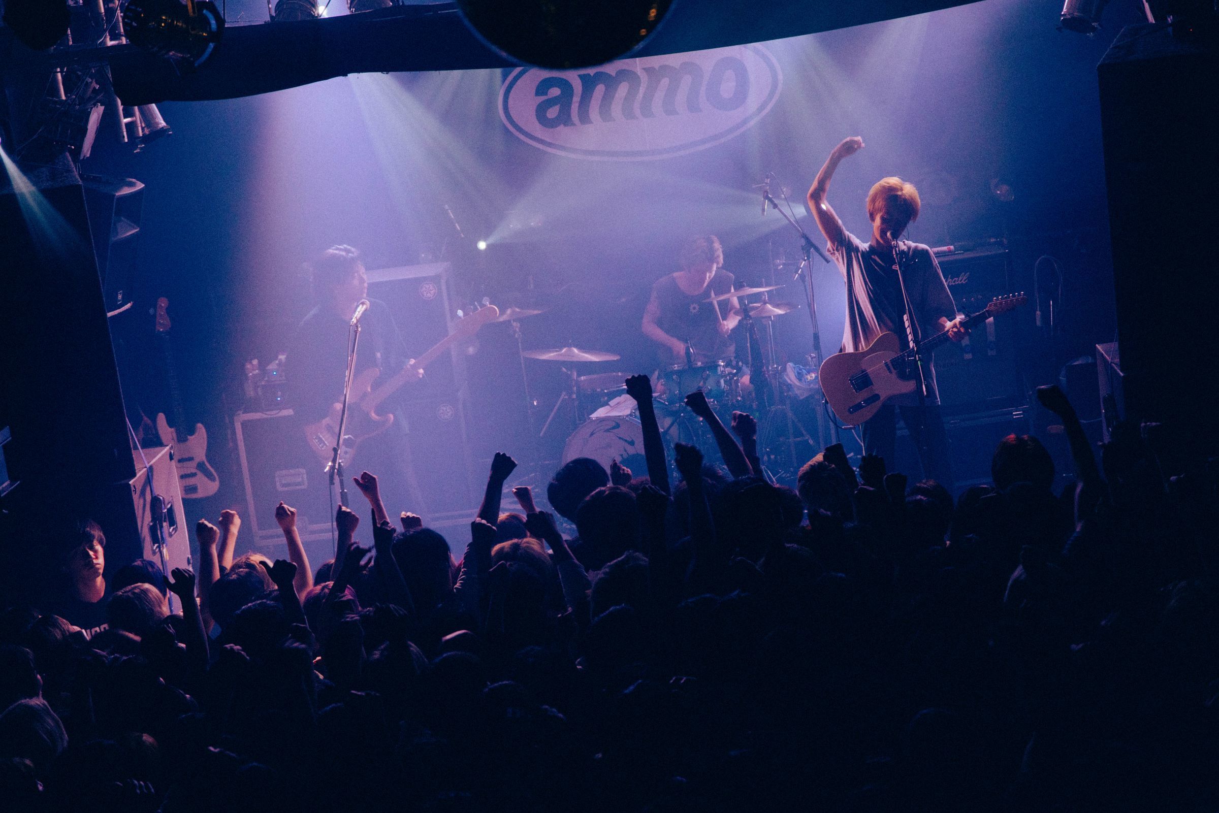 「BRONZEで歌ってきた曲」と呟いて披露されたのは、「寝た振りの君へ」。同会場で収録されたMVと、何度もプレイしてきたこの曲を改めて丁寧に紡いでいく3人の姿がオーバーラップする。映像と明確に違うのは、今夜はammoのワンマンライブであり、彼らの背後には大きなバックドロップが掲げられていること。何十倍にも大きくなったバンドの姿に、目頭を押さえるファンも見られた。「re: 想 -EP」収録の「koi」「ブルースを抱きしめて」と1stデモシングルの表題曲「寝た振りの君へ」という新旧のスローチューンを並べ、じっくりと聴かせた後は、ライブハウスで歌い続けることの覚悟が込められた「CAUTION」で再びアクセルを踏み込み、怒涛の後半戦へと突入。