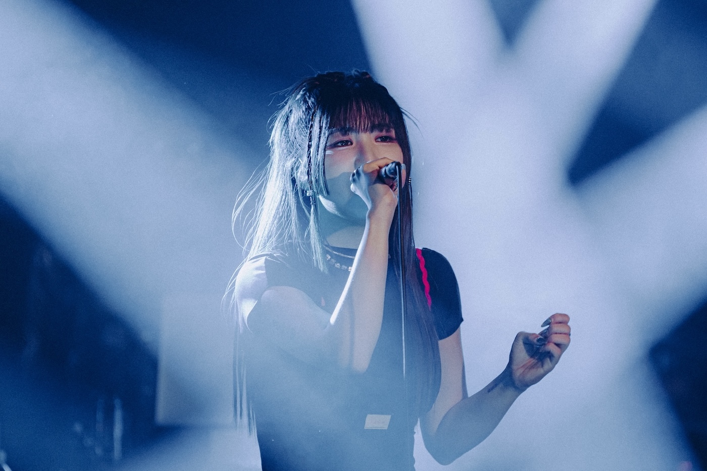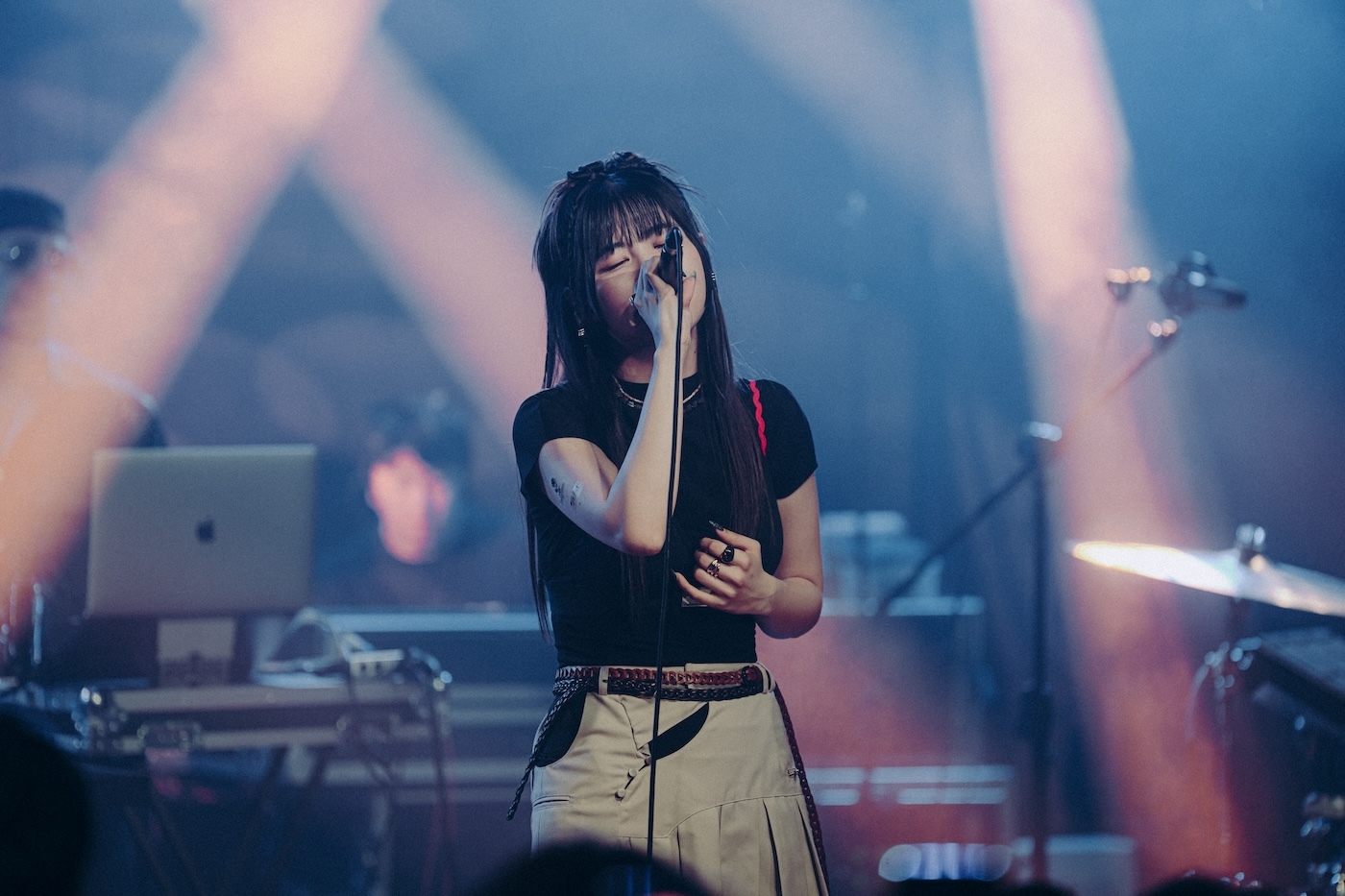 最初の3曲を勢いよく歌い上げたあと、流暢な韓国語でeillがファンに向けて挨拶を行うと、すかさず次曲「HUSH」のイントロへ。この日の「HUSH」は、お客さんと一緒に歌うことを想定したアレンジが施されており、ファンに向けてコールアンドレスポンスのレクチャーをしたのちに、会場が一体となって歌うように披露された。続けて「Succubus」と「初恋」をメドレー形式で歌い上げると、昨年配信されて大きな話題を呼んだAmazon Prime Videoの恋愛リアリティ番組『ラブ トランジット』主題歌の「happy ending」を披露しファンを虜にした。
