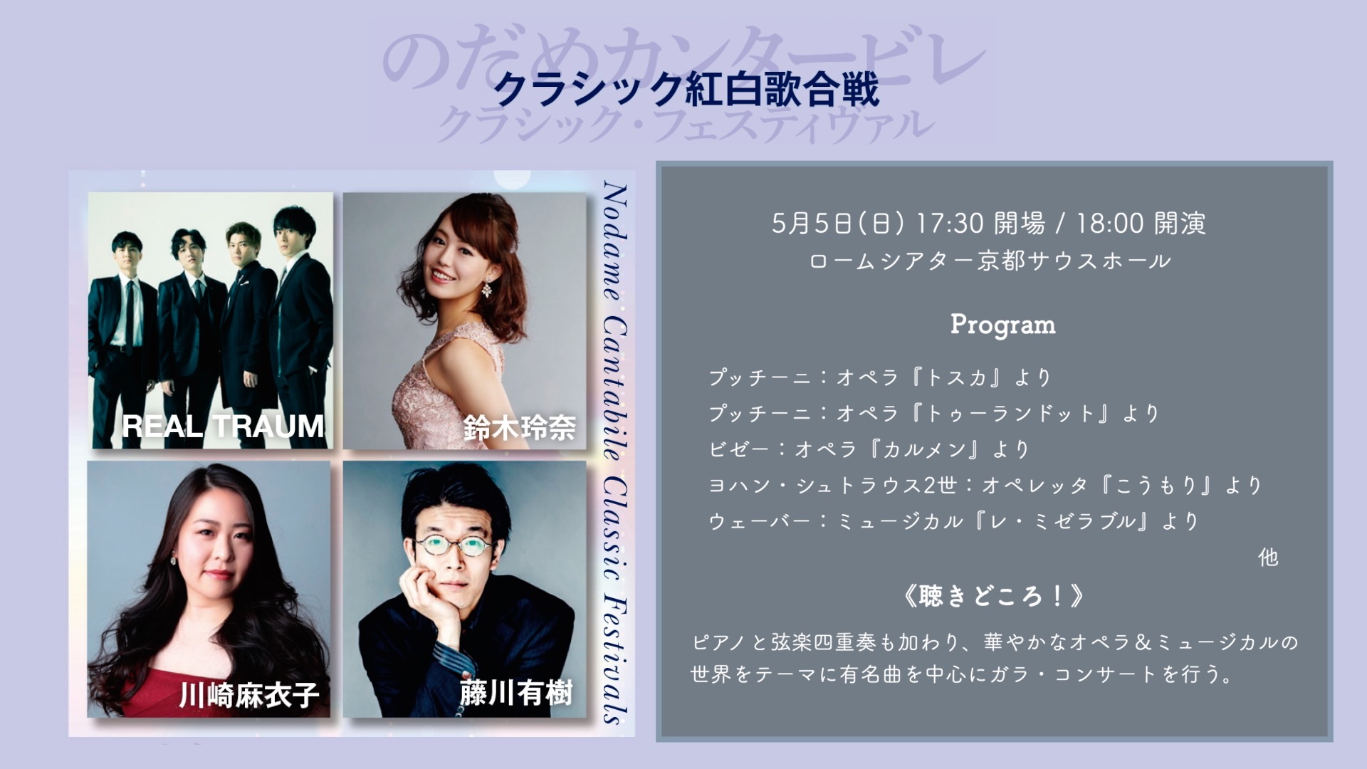 もうひとつは『クラシック紅白歌合戦』。人気急上昇中の男性ヴォーカルグループ「リアル・トラウム」の4名とメゾソプラノの川崎麻衣子、ソプラノ鈴木玲奈が、オペラからオペレッタさらにはミュージカルまで、歌ものクラシック150年の歴史を45分でたどる。