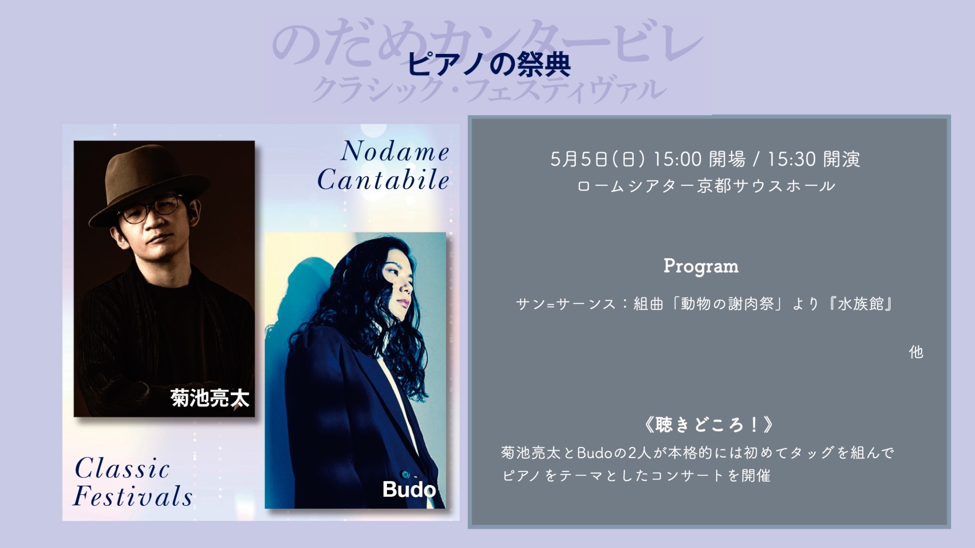 1つ目は、菊池亮太とBudoが意外にも“初めて”がっぷり四つに組んで、2台ピアノで展開する『ピアノの祭典』。Budoが得意のシューベルト/リスト編曲の「魔王」やリストの「ラ・カンパネラ」を披露すれば、菊池亮太も長年温め続けてきた「パガニーニ変奏曲」やドビュッシーの12の練習曲の中から弾く。サン・サーンスの組曲「動物の謝肉祭」から、ミステリアスな名曲「水族館」とショパン「革命のエチュード」さらにラフマニノフの「パガニーニの主題による狂詩曲」第18変奏で、どんな共演を「魅せて」くれるのか楽しみである。