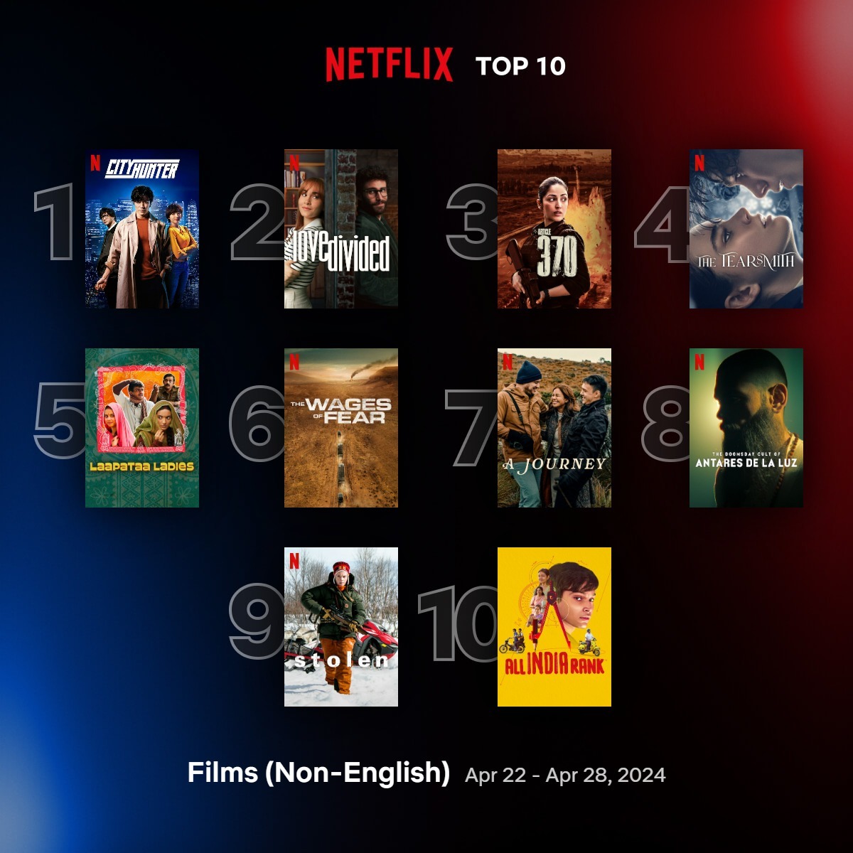 Netflix映画『シティーハンター』は、5月25日(木)の配信スタート直後から「日本の今日の映画TOP10」1位に登場。5月1日(水)発表のNetflix「日本の週間TOP10(映画)」でも1位を獲得している。そして、「週間グローバルTOP10(非英語映画)」(4月22日から28日)でも初登場1位を記録。あわせて、フランス、韓国、香港、ブラジルなどを含む世界32の国と地域でも週間TOP10入りを果たしている。