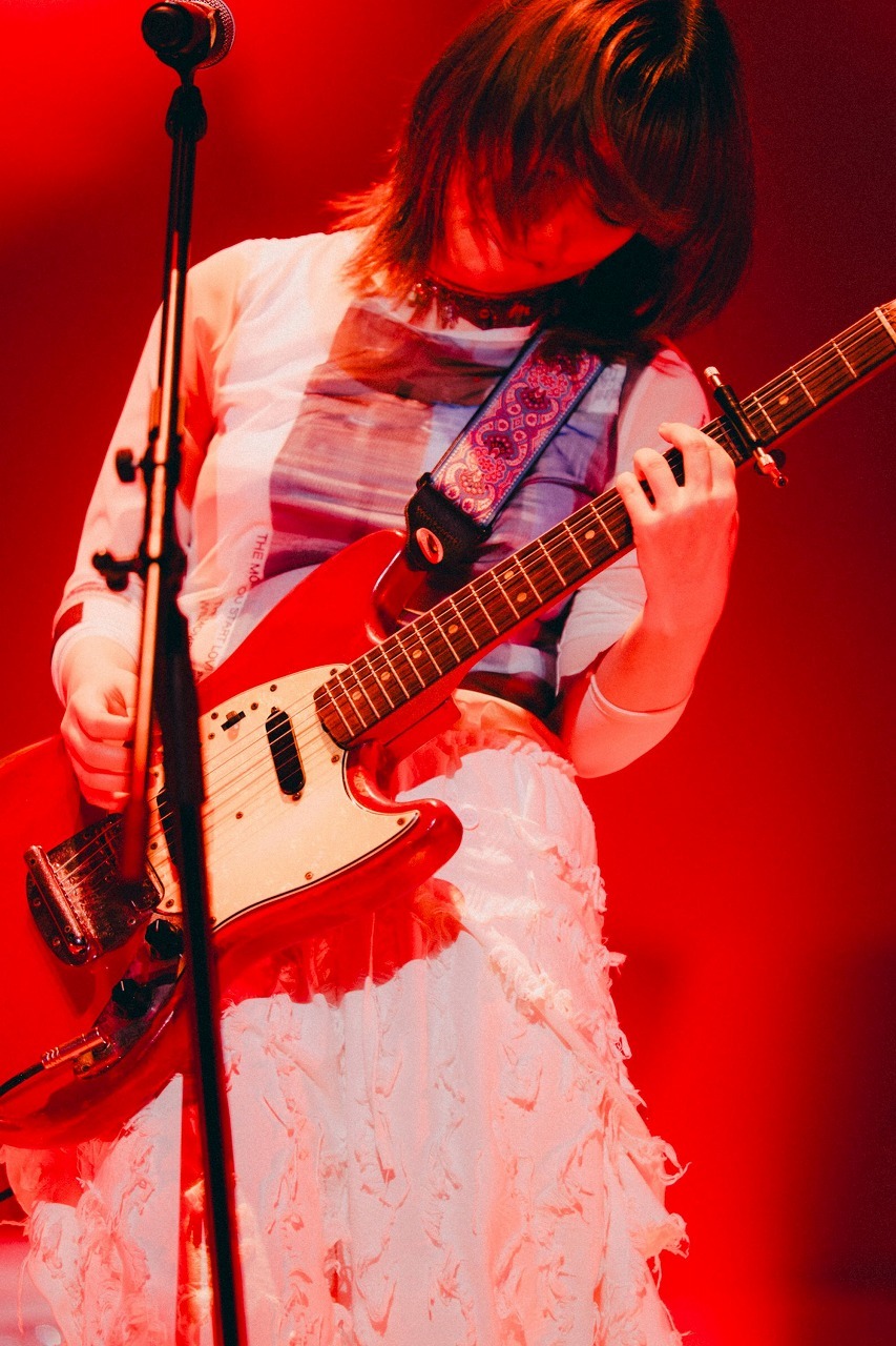 繰り返しになるが、1曲ごとにその世界に没入させることが可能なのは、やはりツアー11本目のバンドとの練度なのだろう。ジャンルに拘束されない彼女の楽曲をライブの最適解でアレンジし、深めてきた5人で共通したビジョンが見えているのだと感じた。終盤に向け、「心残りなく燃え尽きていってください」と自身にも言っているようなにしな。グッとヘヴィかつ厚く、グランジと言っていいようなアンサンブルと切実な発声が刺さる「スローモーション」、フルアコースティックギターからストラトに持ち替えてのトレブリーな響きで曲の人格を表すような「ヘビースモーク」と、サイドギタリストとしての音作りも念入り。今も彼女の人気曲筆頭だが、いい意味で慣れることはないのだろう。苦しい想いはずっと切実な声のままこちらの感情も締め付けてくる。本編ラストに向けてどんどん内面の深いところへダイブしていく構成は彼女らしいと言えばそうだし、ステージパフォーマーとしてタフになってきたからこそできることでもあるのだろう。ただ歌うことに集中して心を込めていくピアノバラード「青藍遊泳」では聴いているこちらも体に力が入る。清冽な決意のこの曲に続いて、世界の滅亡が訪れなかった年、1999年もテーマの一つである「1999」が終わりの始まりのマーチのように奏でられた。誰にも終わりがあることを《地球が滅亡する素敵な夜のこと》と表現する彼女の、これはある種の死生観でもあり、同時に生き方の指針なのだろう。潔くステージを後にし、暗転したステージの背景には映画のエンドロールのようにクレジットが投影された。