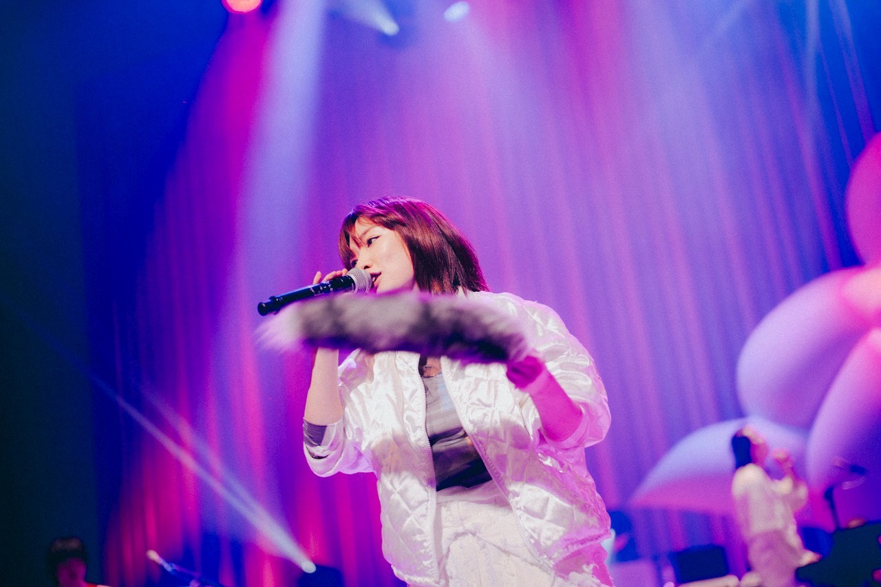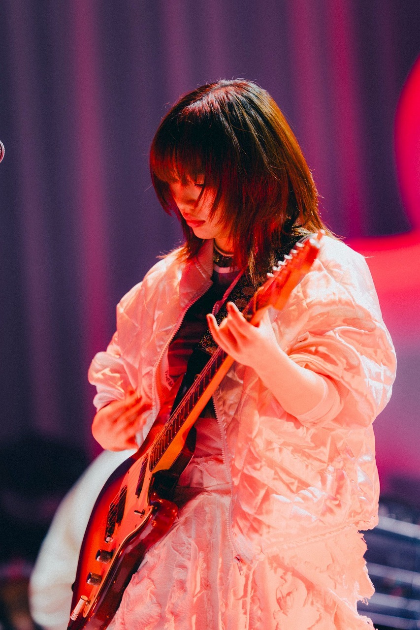 にしなのコードストロークがグルーヴを生み出し、ツインギターの旨みも味わわせる「真白」、再びハンドマイクでの「夜になって」ではそれまでの無邪気さや明るさが影を潜め、いたたまれないような孤独な状態を醸し出す。胸苦しい恋を歌う幼さの残る声は彼女にしかないものだと改めて確信し、ストロボの演出も慟哭を表すようで秀逸だった。夜の情景のひと連なりとしてシームレスに「FRIDAY KIDS CHINA TOWN」に繋げたのもいい。Lo-Fiヒップホップ以降のフロウといえばそれまでだが、ダンサブルな曲での彼女のメロディと言葉の閃きたるや。音源よりフィジカルなラガマフィン調のビートも歌を転がしていく。