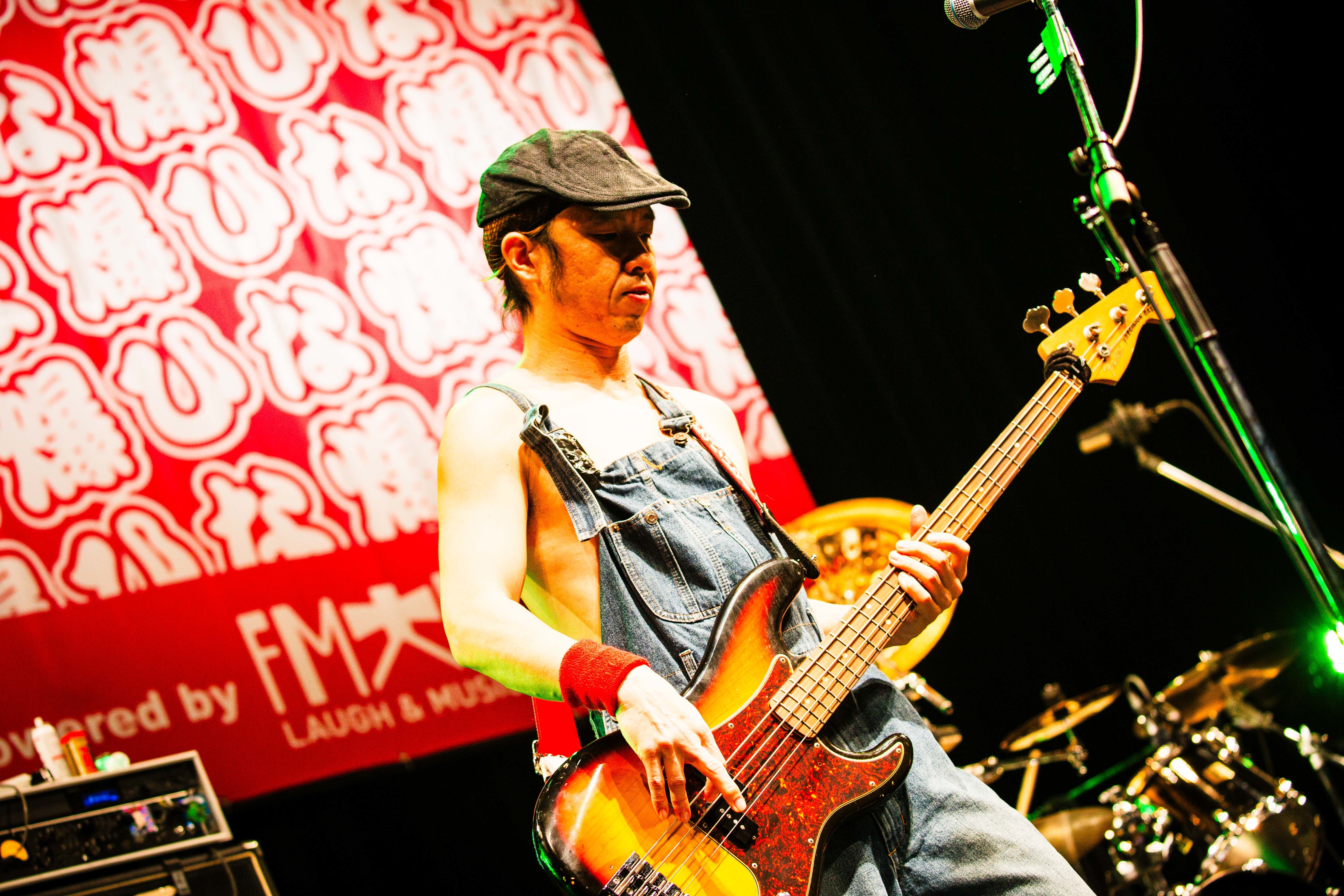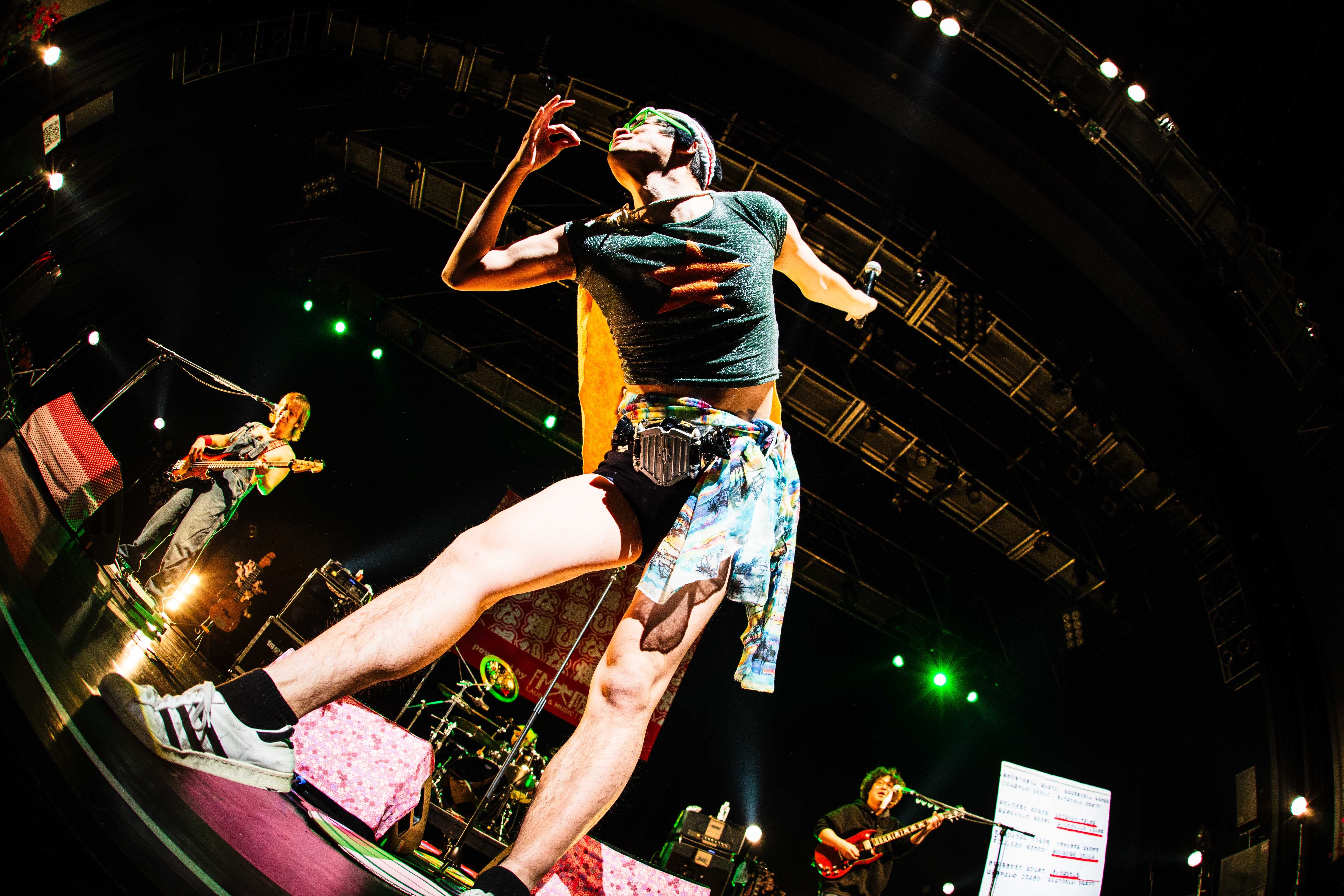 ライブ巧者だらけの『爆ひな』で、彼らが通常運転のはずがない。北島康雄(シンガー)はキュウソネコカミのマスコット・ネズミくんに扮し、U太(B)は裸オーバーオール姿でグレートマエカワ(B/フラワーカンパニーズ)化。そして盆地テクノパーカーに身を包み、岡崎体育を現したまさやん(G)と、登場から一気に会場の腹筋を崩壊させた四星球。完全に黒子と化したモリス(Dr)の姿に、「(超能力戦士ドリアンと一緒で)僕たちもドラムがいないんですよ〜」(康雄)とのたまう始末。そんなたくさんのツッコミどころもお構いなしに、初っぱな「UMA WITH A MISSION」では、生まれたての馬=康雄が立ち上がる瞬間を応援するため、あっという間になんばHatchが一体化!