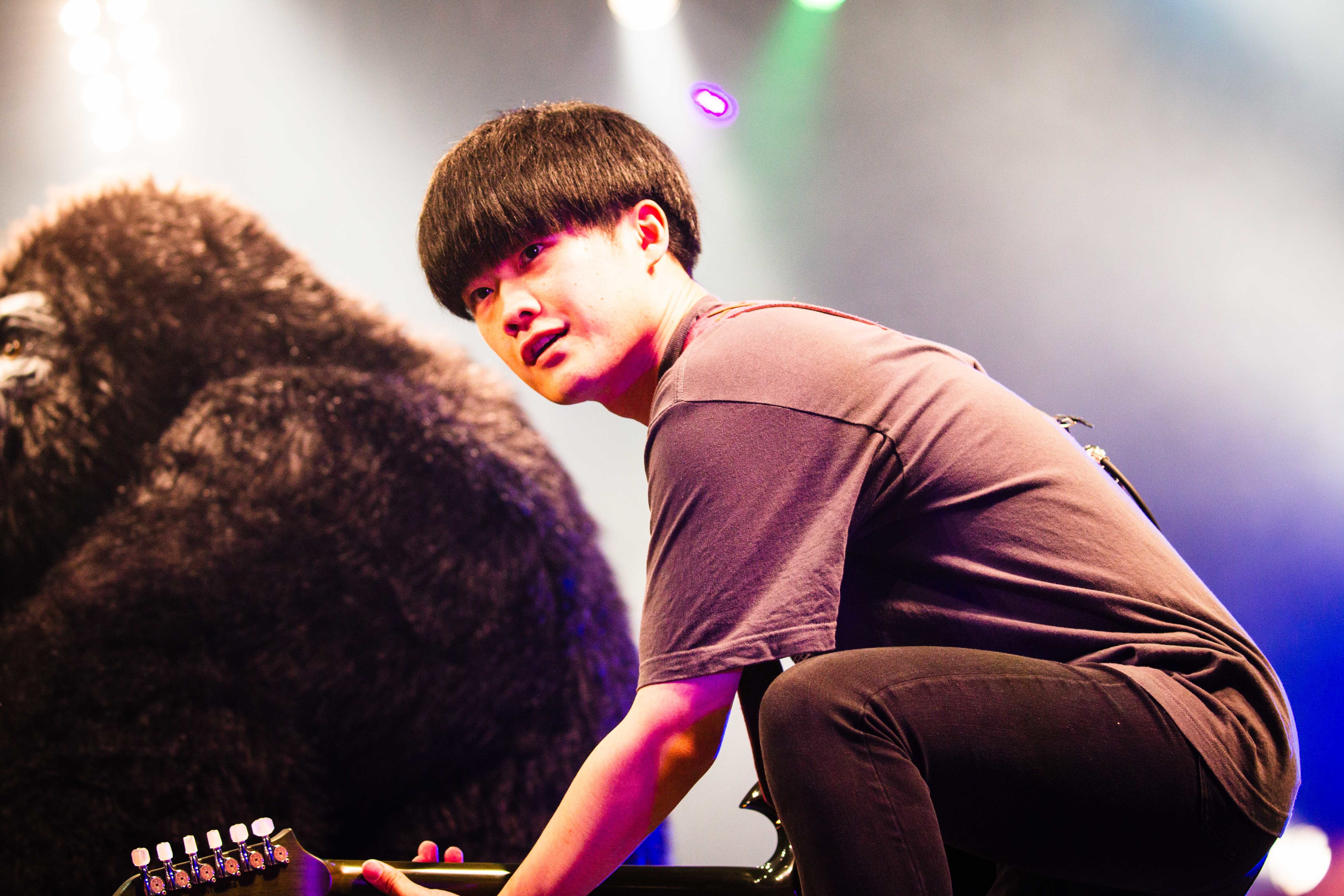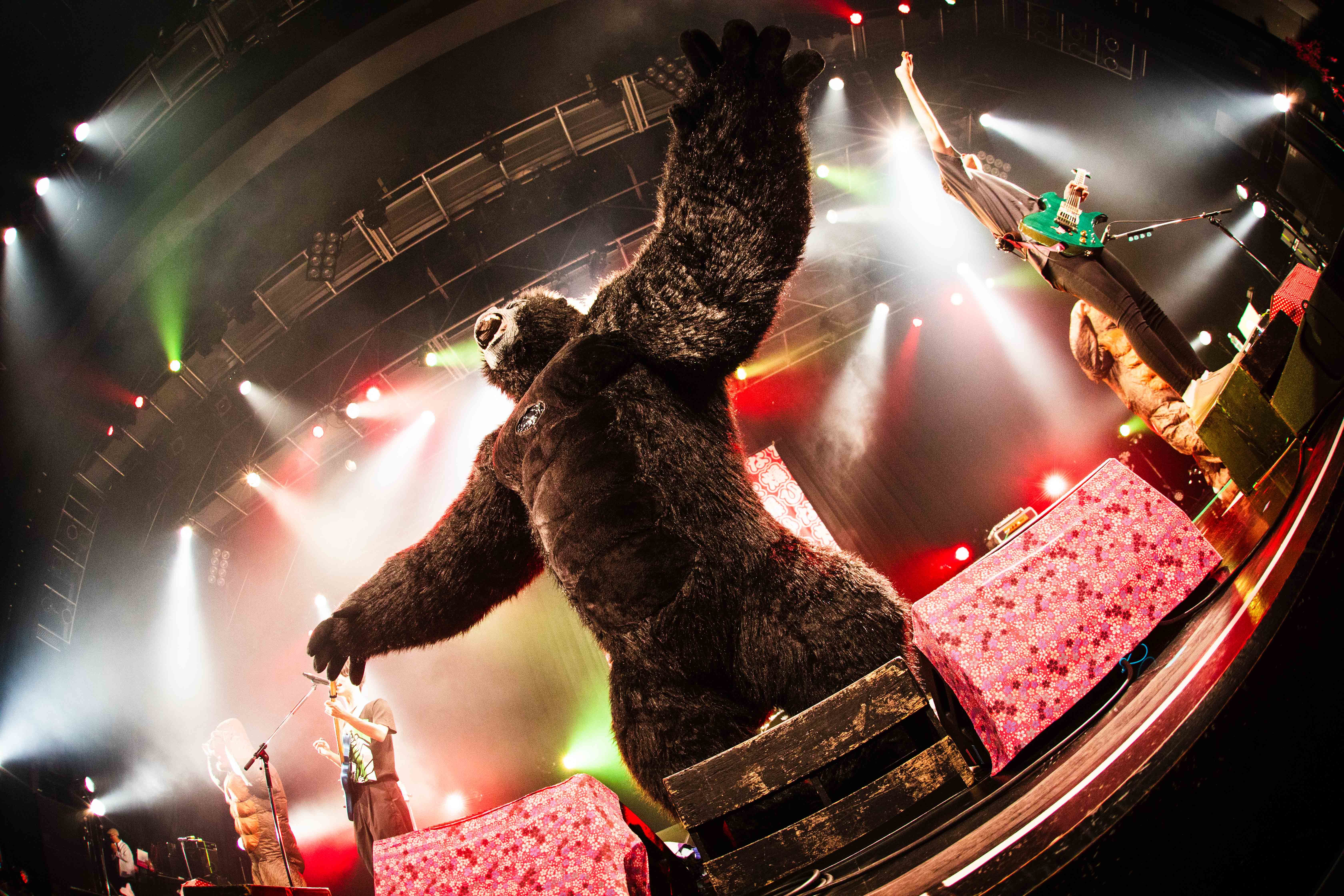 ド頭から会場を沸かせたのは、超能力戦士ドリアンの3人だ。まずはライブでは使わないはずのドラムになぜか煌々とスポットライトが当たり、「僕はドラム! 今から超能力戦士ドリアンのライブが始まるよ〜!」と話し出す、まさかの幕開け。1曲目の「ゴリラのドラミングーチョキパー」から、やっさん(G.Vo)とけつぷり(G)の2人に加え、ゴリラの着ぐるみ3頭が現れしっちゃかめっちゃか。が、その光景にも慣れたものという様子なのは、さすが『爆ひな』のオーディエンスだ。センターのゴリラからおーちくん(Vo)が飛び出すという、家に帰ったら夢に見そうな光景を経て、続いては自己紹介ソング「いきものがかりと同じ編成」へ。