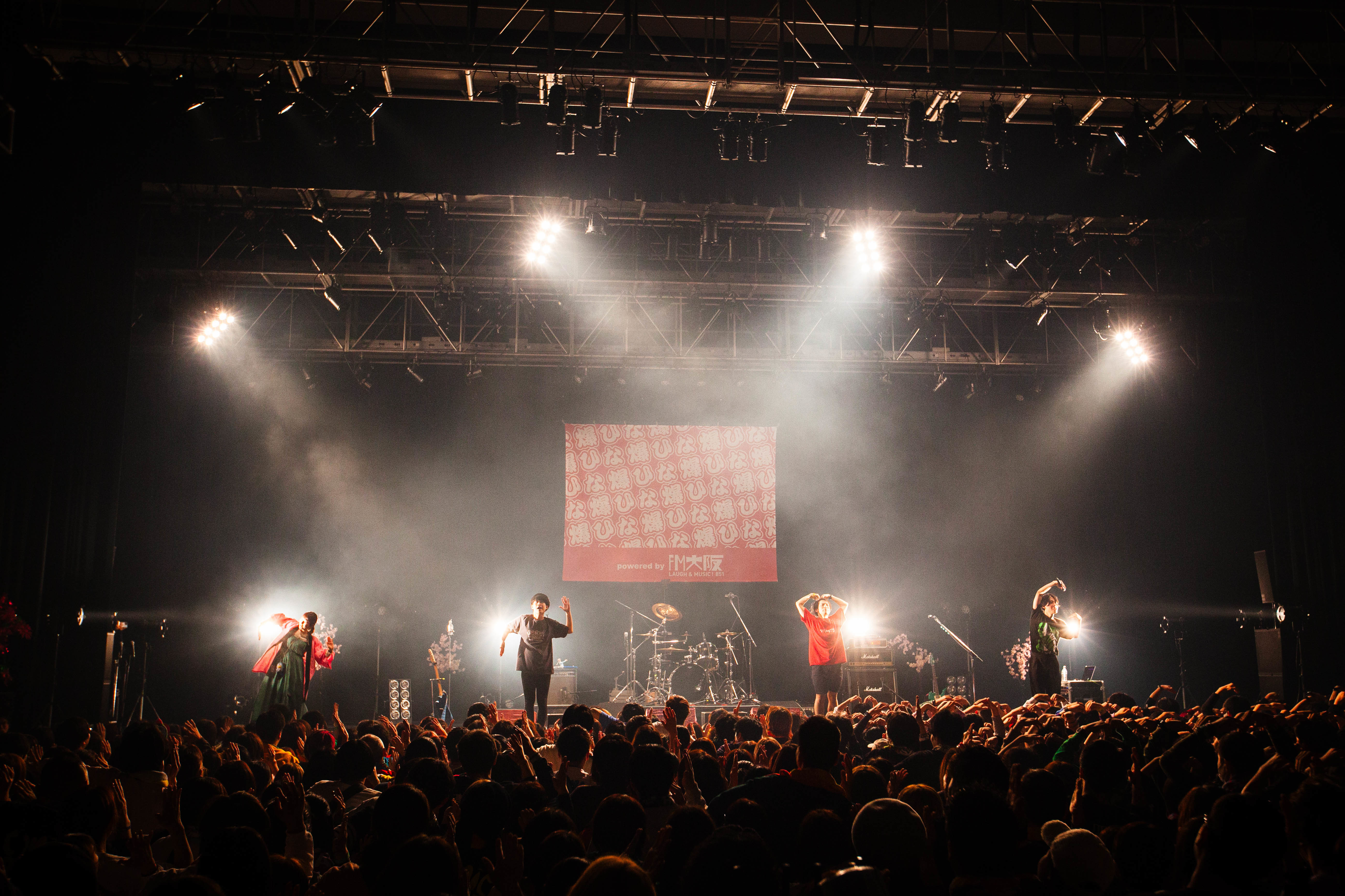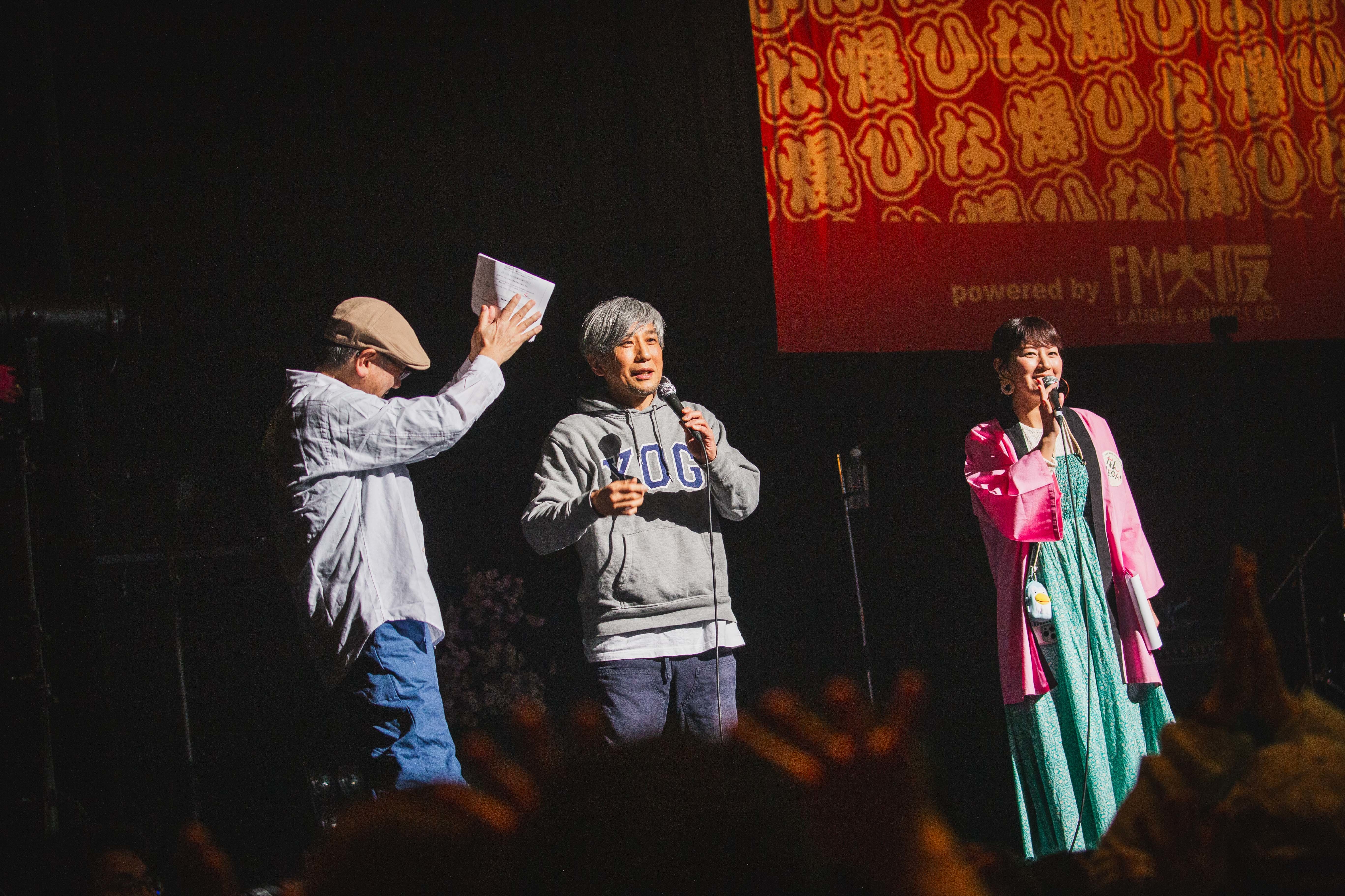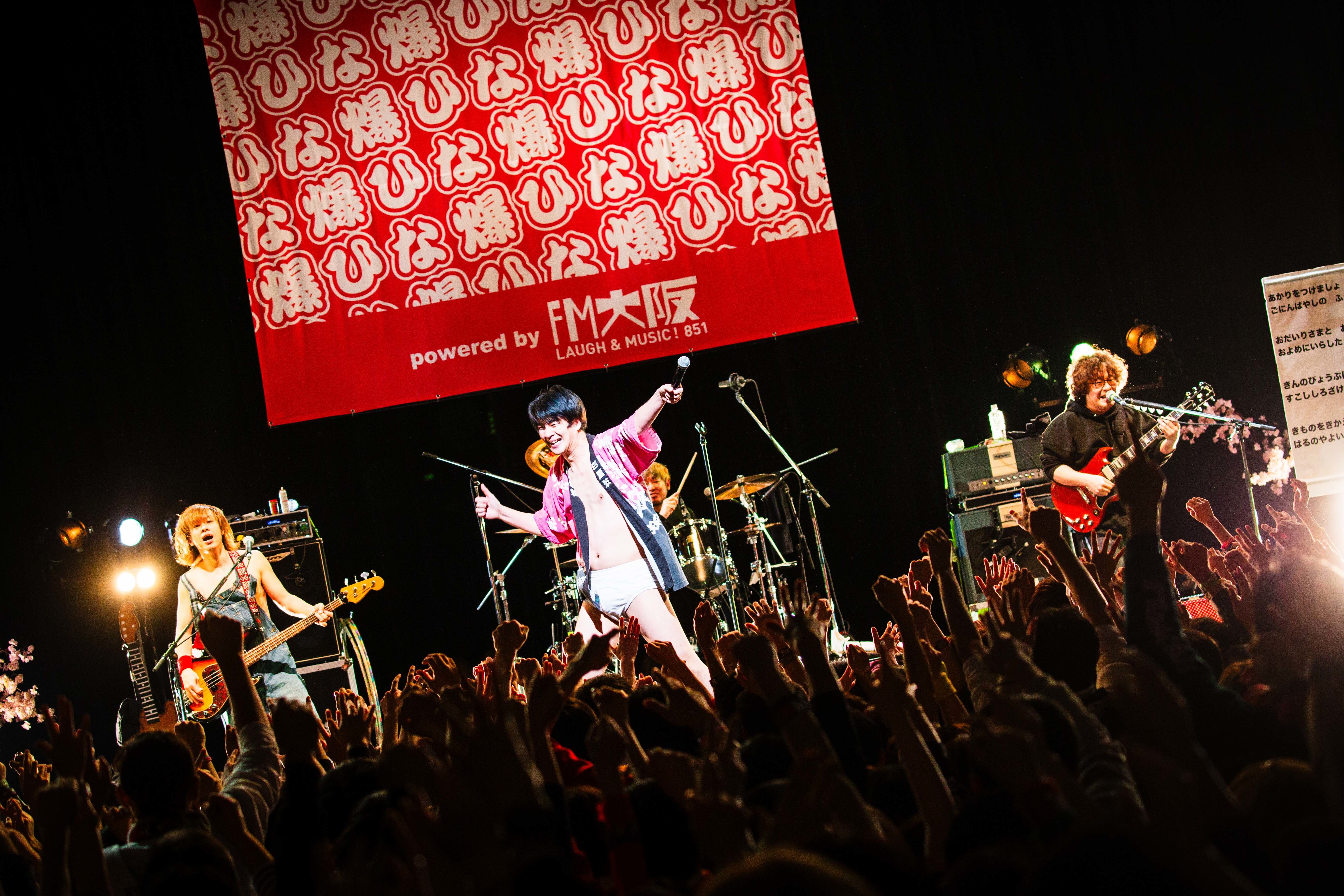 開演の時刻になると、まずはFM大阪の人気番組『なんMEGA!』のDJ・前田彩名と、『爆ひな』発起人のひとりであるFM OSAKAの山本氏(ex 名物プロデューサー)や清水音泉の田口氏が登壇。清水音泉と共にFM大阪でロックの深夜番組『EZM』『FUTURE AUDIO 851』『ミッドナイト☆ジャングル』をやっていたことをキッカケに発足した『爆ひな』の足跡やイベントの楽しみ方を語り、いよいよライブは開幕へ。