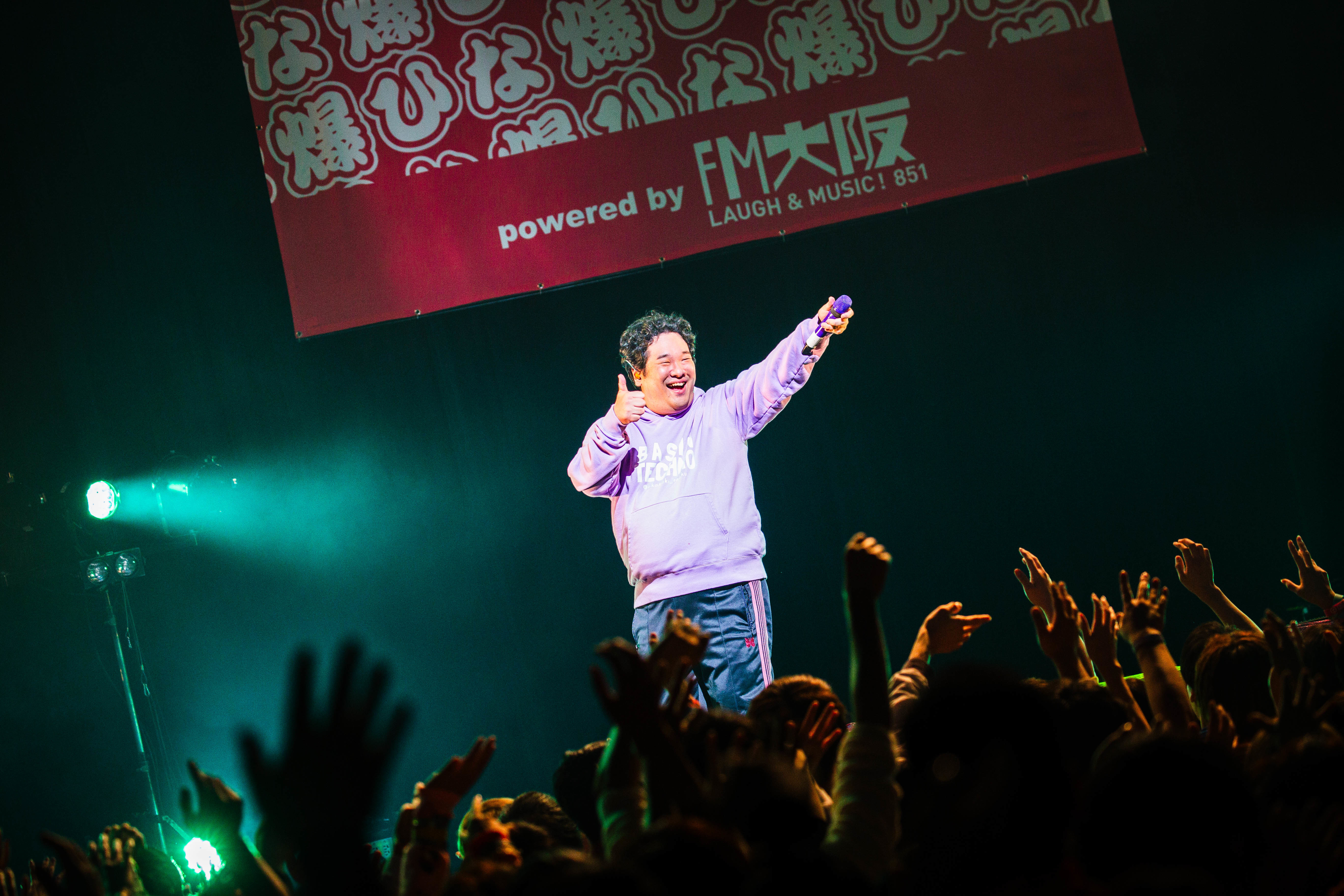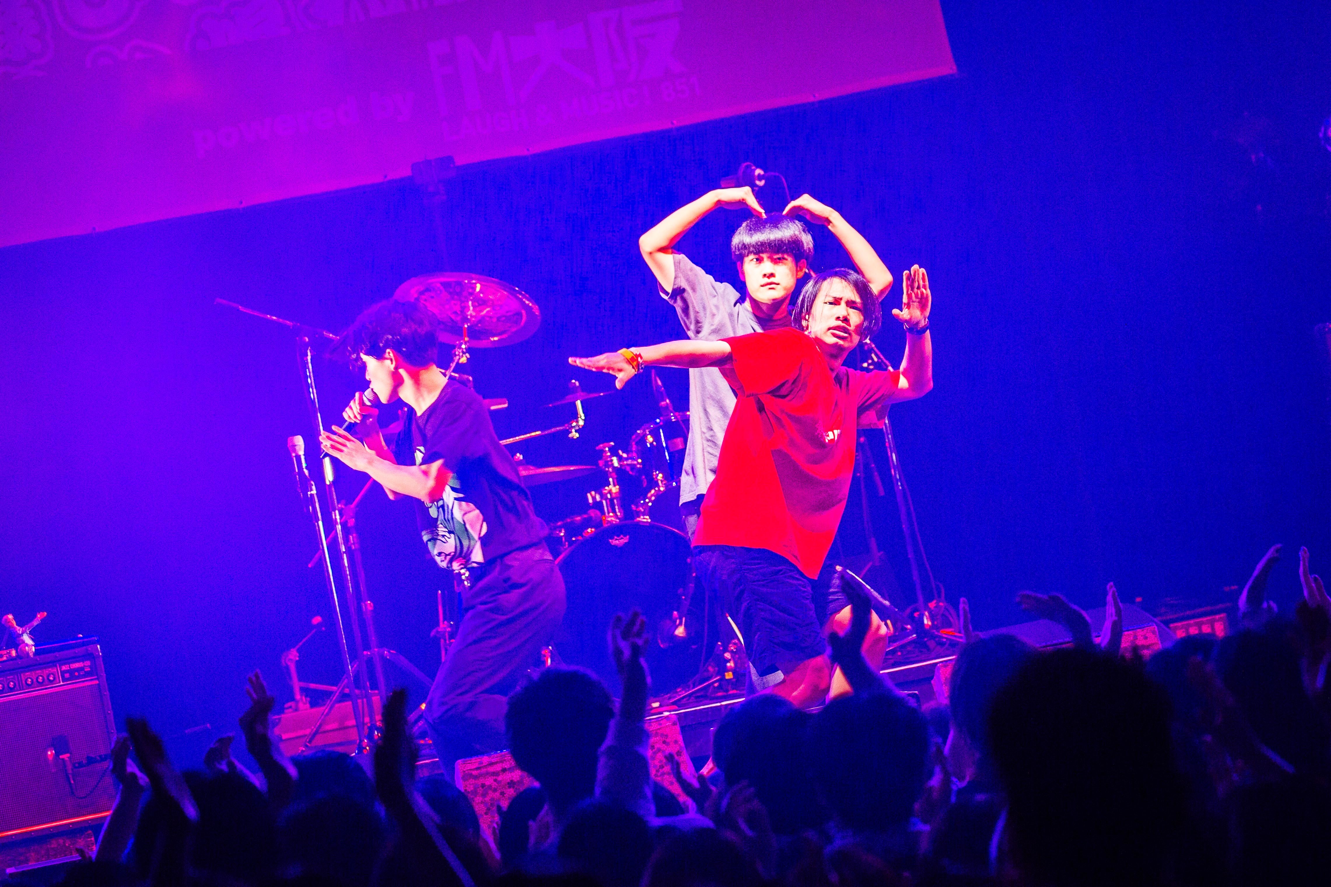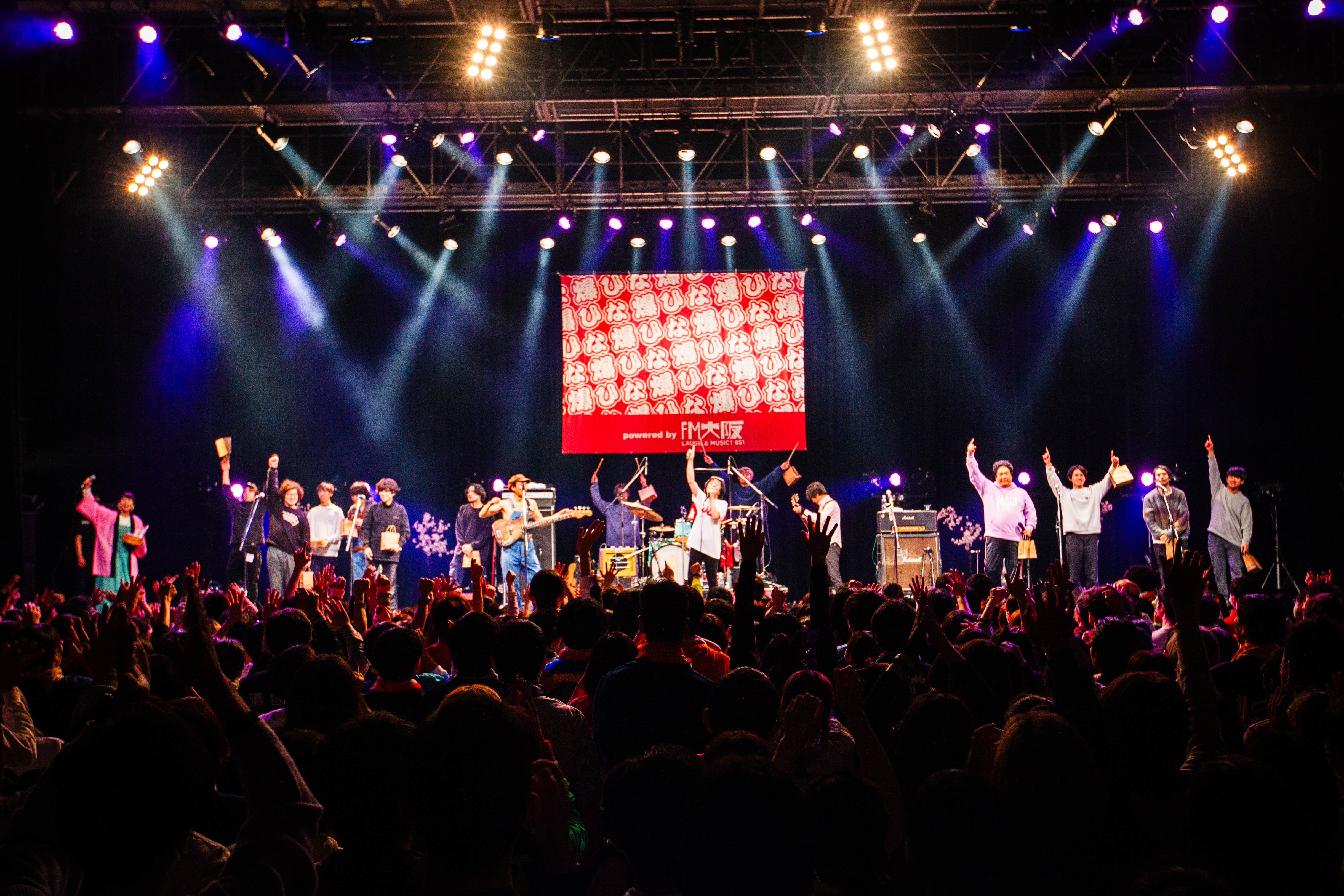 開演の時刻になると、まずはFM大阪の人気番組『なんMEGA!』のDJ・前田彩名と、『爆ひな』発起人のひとりであるFM OSAKAの山本氏(ex 名物プロデューサー)や清水音泉の田口氏が登壇。清水音泉と共にFM大阪でロックの深夜番組『EZM』『FUTURE AUDIO 851』『ミッドナイト☆ジャングル』をやっていたことをキッカケに発足した『爆ひな』の足跡やイベントの楽しみ方を語り、いよいよライブは開幕へ。