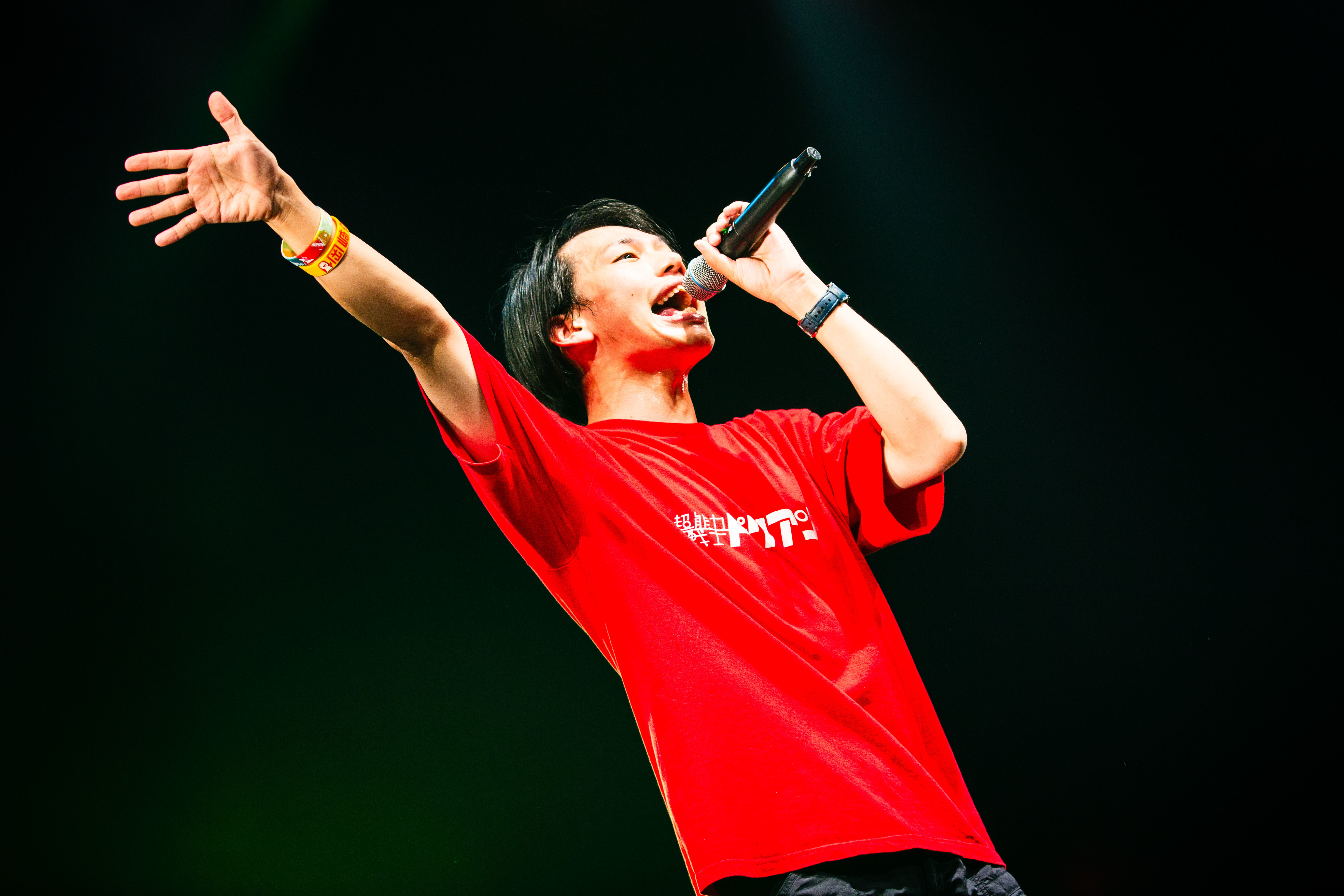 舞台袖では、大物映画監督のようにその様子を四星球・北島康雄(シンガー)が見守っていたようで、「(ライブを見てくれるのは)うれしいんですけど、後からダメ出しあるからな〜」とボヤく一幕も(笑)。「今日は縦ノリの雰囲気やけど、横ノリもしてみよう」と促し、「サブマリン」ではラスタカラーのライティングの下、満面の笑みを浮かべながらシニカルな歌詞を紡ぐ岡崎体育。ピースな雰囲気を保ちつつ、歌詞の中に今宵の顔ぶれの名前を入れる粋な計らいも。さらに「ぶっ飛ばしナンバーいきます!」と続けて「なにをやってもあかんわ」をお見舞いする。華麗なエアギターを挟み、最後は拳を高く突き上げ、「あなたの負のエネルギーを天に飛ばして!」と開放感いっぱいに歌唱。