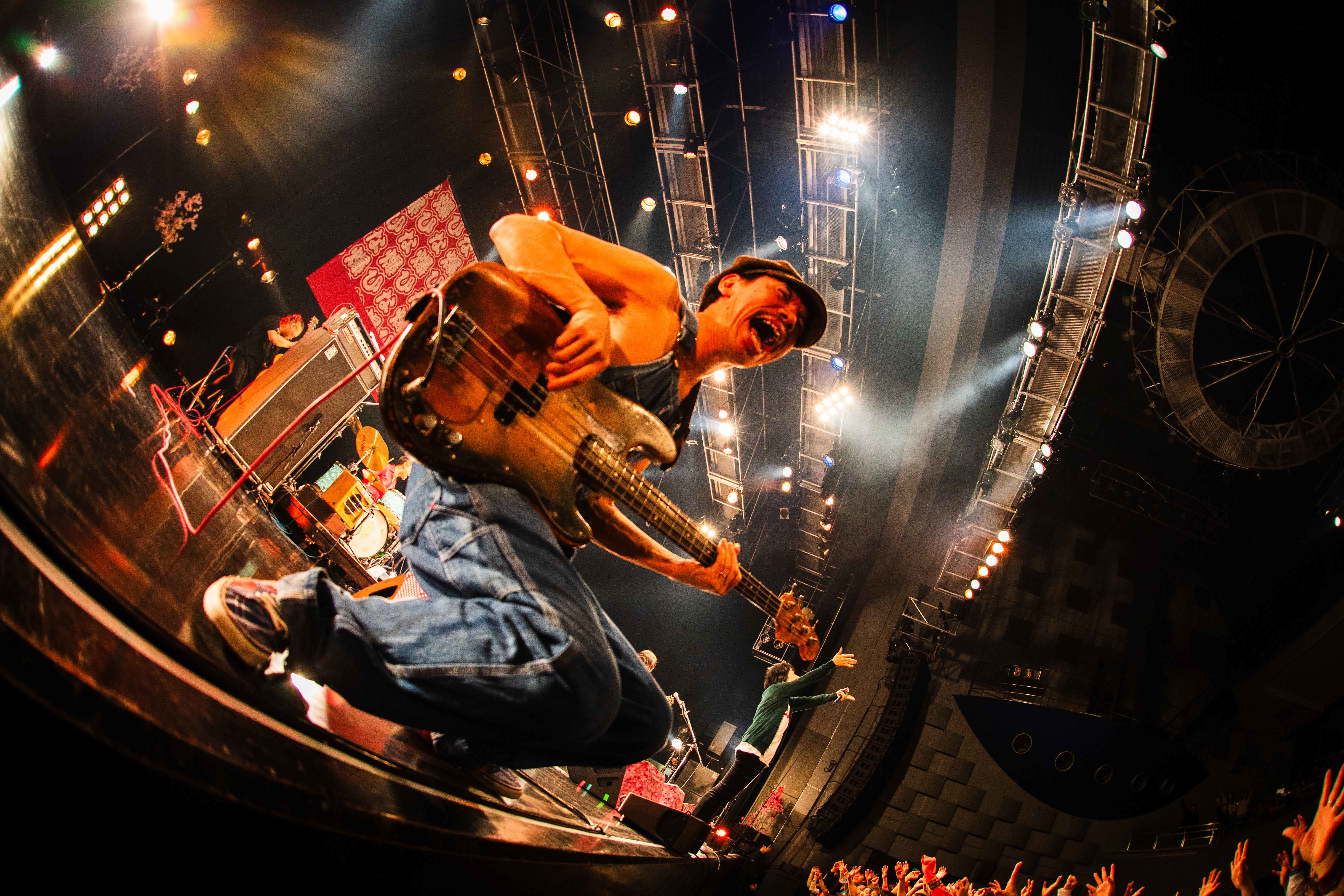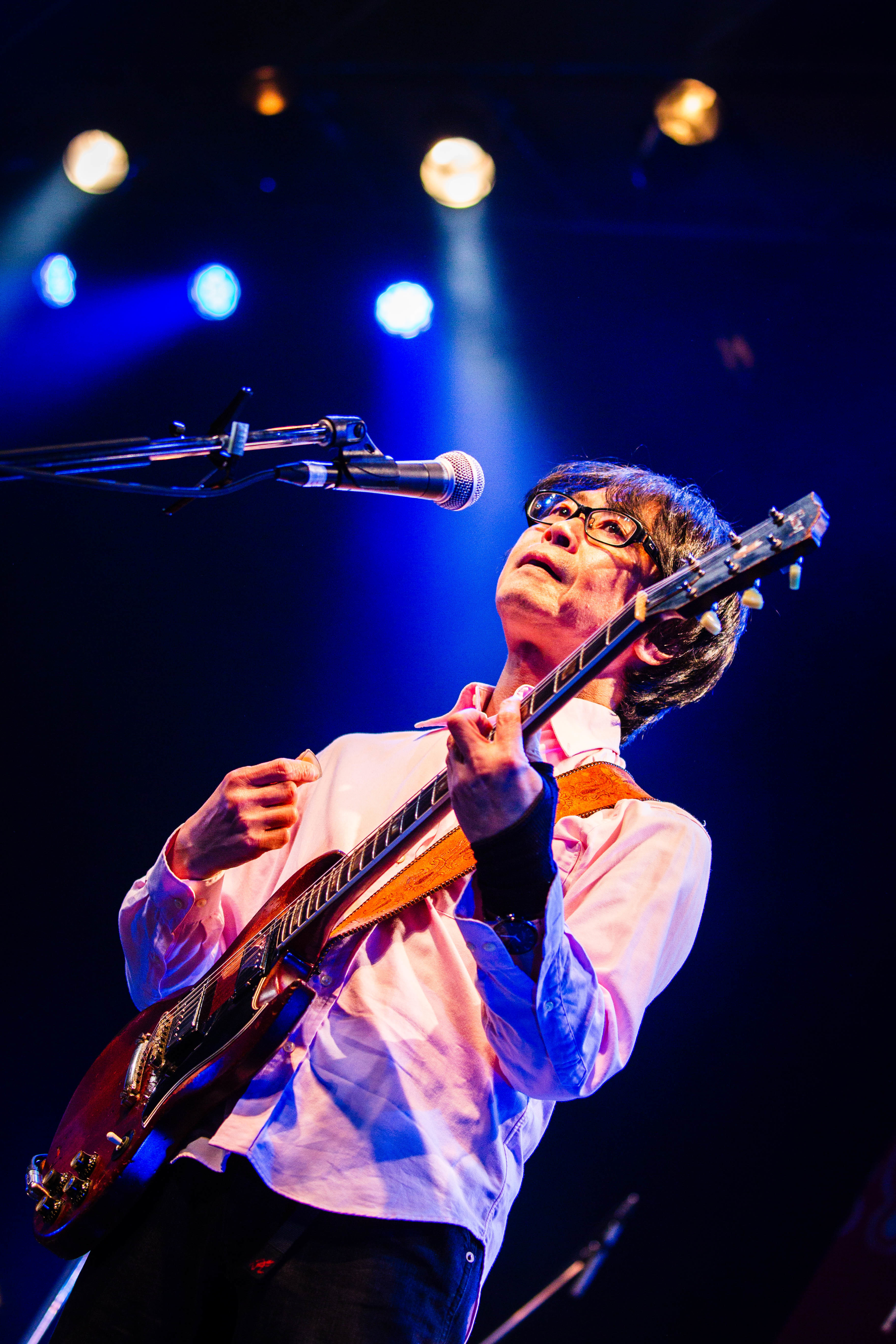 いよいよオーラスを迎えるなんばHatchへ、フラワーカンパニーズの4人がお出ましに。底抜けに明朗な「行ってきまーす」で口火を切り、鈴木圭介(Vo)のブルースハープや竹安堅一(G)のドライブするギターが会場いっぱいに響きわたる。「はぐれ者讃歌」では真っすぐ伝わる言葉のパワーをひしひしと感じさせ、今年結成35周年を迎える彼らには、初めて耳にしたときからいつまでも消えないフレッシュさを感じずにはいられない。ちょうどこの3月3日リリースだった新曲「ハートのレース」では、ミスター小西(Dr)の鳴らすリズムが場を鼓舞するようで、たくさんの拳が突き上がるのが何とも印象的だ。