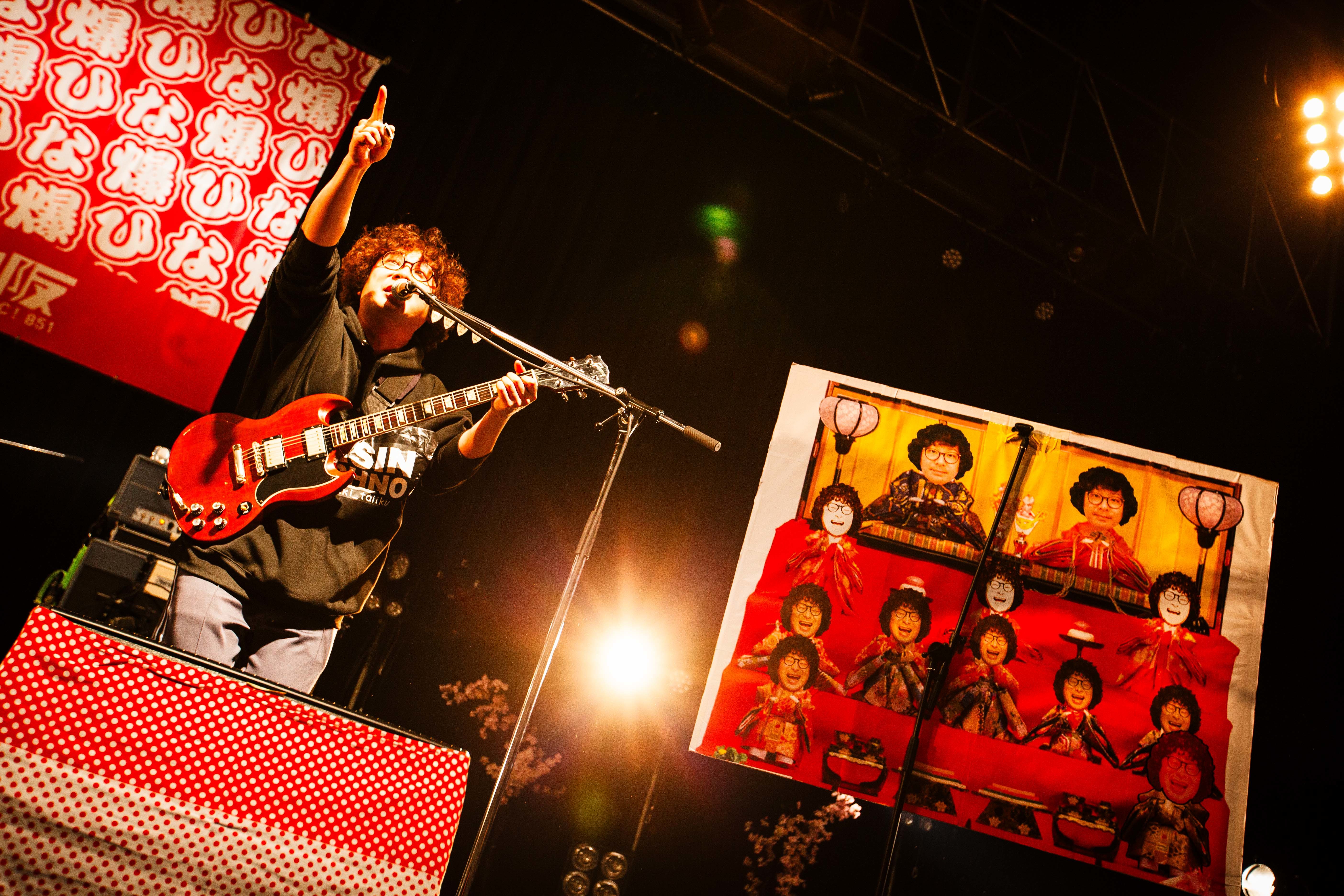 MCでは「4年経って、(今日の出演者たちは)やっぱり大きい先輩方だなと。でも負けない存在になるよう頑張ります。また次の4年後、絶対売れるから!」(やっさん)と、ふいに熱い決意を口にするのだから、緩急つき過ぎ。「ヤマサキセイヤと同じ性別」では、出演者の段ボール製等身大パネルを客席に投げ込み、ステージに返ってくるまでのレースを行うカオスぶりだ。ラスト「焼肉屋さんの看板で牛さんが笑っているのおかしいね」まで全6曲、オープニングアクト(爆ひなでは「あかりをつけましょアクト」)の概念をブチ壊す濃厚さで、『爆ひな』の成功を確信させるひとときとなった。