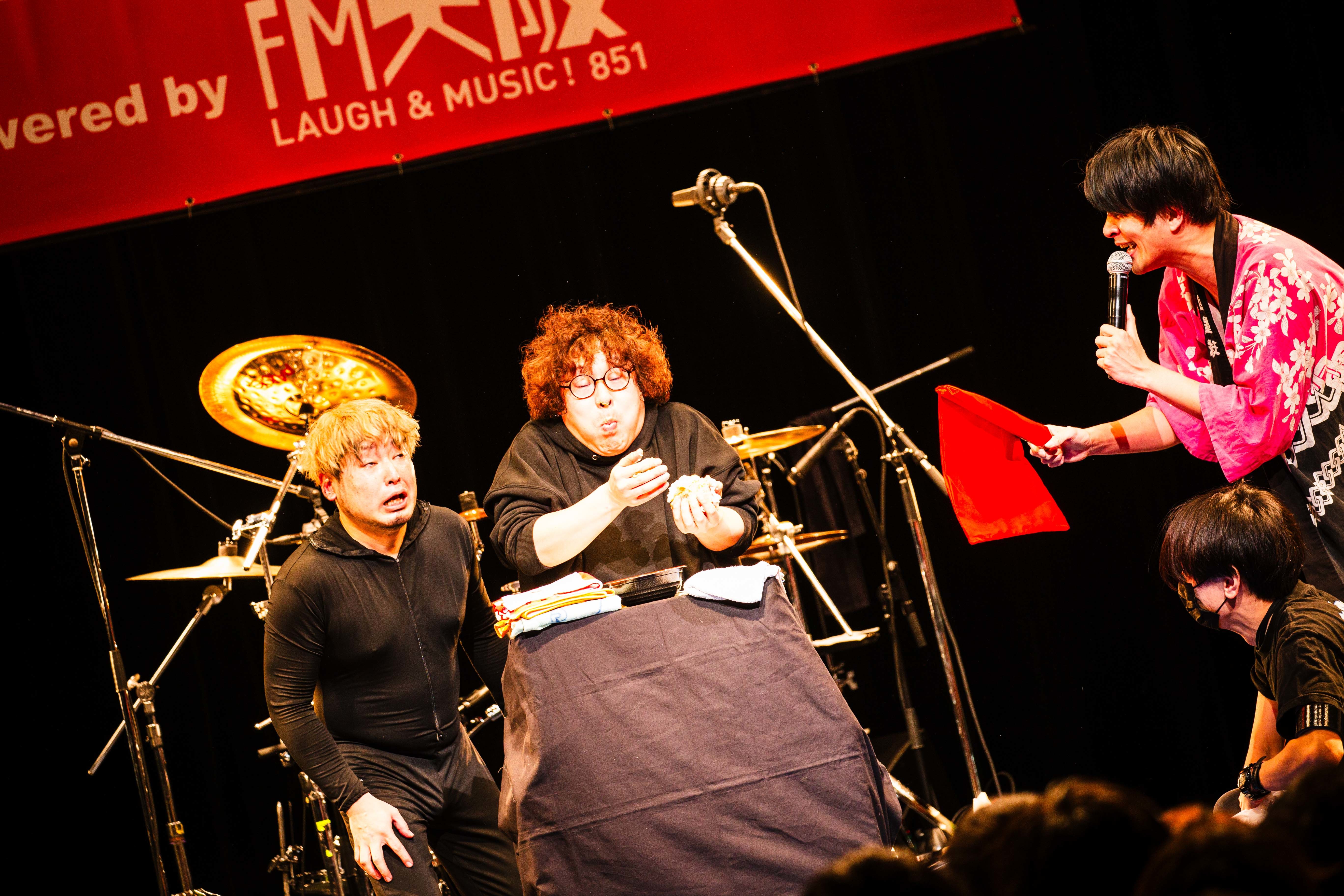 最前で構えるセキュリティスタッフにマイクを向けて困惑させるなど、やりたい放題な一方、底抜けの包容力で大団円へ。曲終わりでは、翌日3月4日が誕生日のまさゆきに、モリスが握った特大サーモン寿司(たっぷりわさび入り)がふるまわれる一幕も。雛人形の<赤いお顔の右大臣>ばりの表情となったまさゆきで、四星球の大狂乱は幕を閉じた。