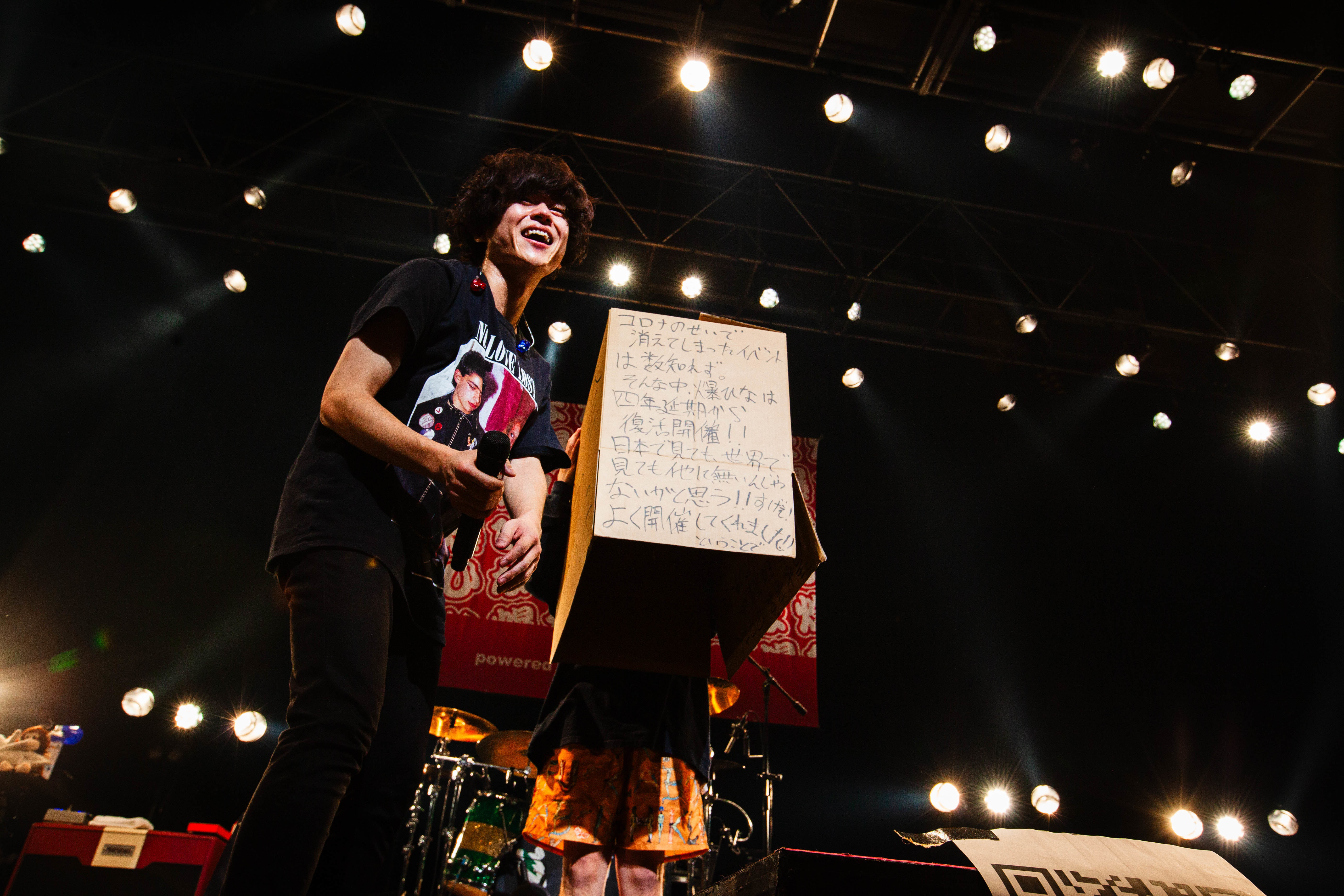 さらに「社会のしがらみ」のくだり(=さまざまな困ったことを段ボール箱に書き殴ったものにセイヤが突っ込んで粉砕するお約束)が、コロナ禍以降初めて復活を果たした初期の代表曲「困った」では、数え切れないほどの歓喜の声が上がる。この日選ばれたしがらみは、清水音泉の田口氏が遭遇したマッチングアプリ詐欺被害(笑)。ついでに田口氏の連絡先を勝手に公開するなど(LINE「友だち」追加で300人増えたらしい……)ハチャメチャな一方、「コロナのせいで消えてしまったイベントは数知れず。そんななか『爆ひな』は4年越しで復活開催! そんなの世界でも他にはないんじゃないかと思う。よく開催してくれました!」(セイヤ)と熱い言葉も。