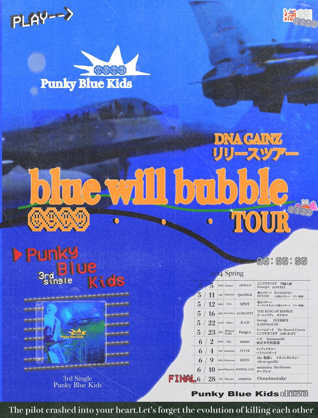 DNA GAINZは、全11公演を回るリリースツアー『blue will bubble TOUR』を、本日5月5日(日)島根・出雲APOLLO公演を皮切りにスタート。ツアーファイナルとなる6月28日(金)島根・松江canova公演には、同じく島根出身のOmoinotakeを対バンに迎える。