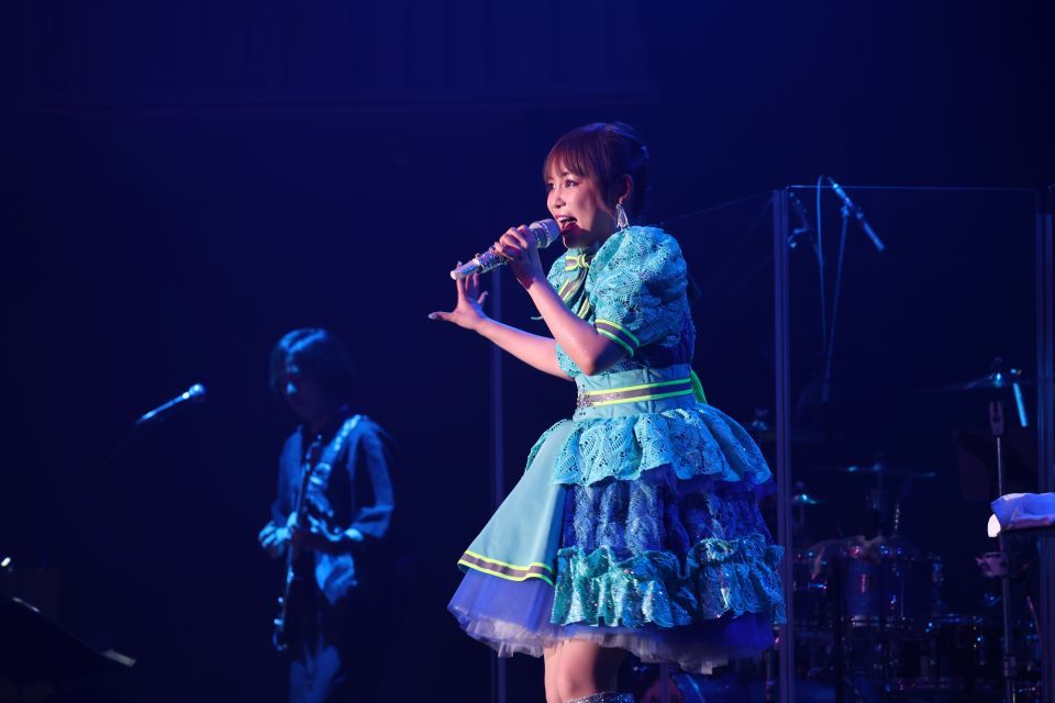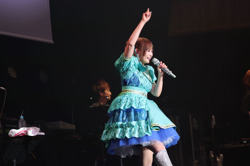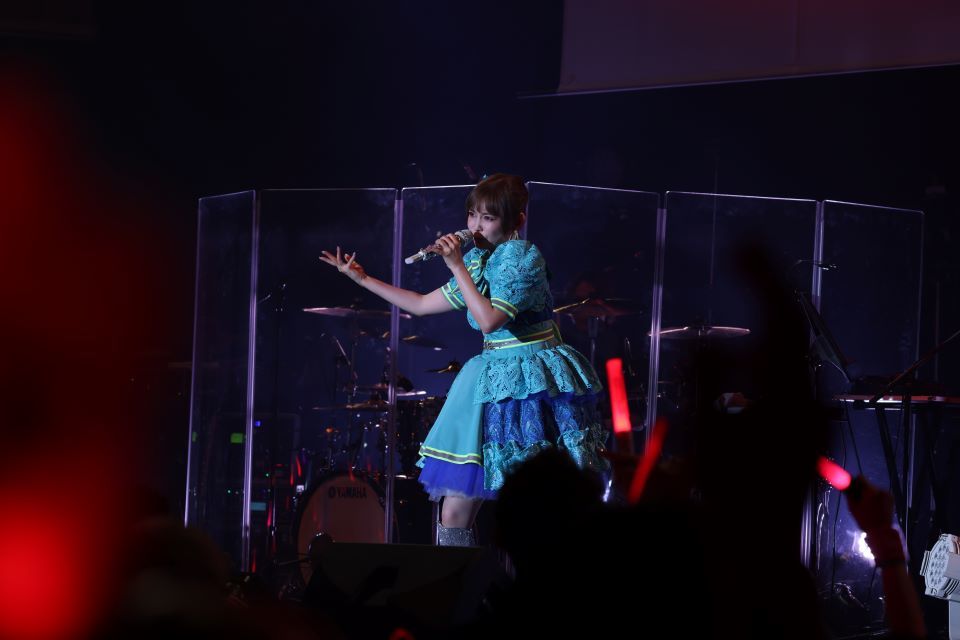夜公演は、ブルーグリーンの衣装に身を包んで登場。キュートなナンバーが並んだ昼公演から一転、夜は自身の代表的ロックナンバー「9lives」からスタート。休む間もなく「diamond high」で一気にボルテージは最高潮に。