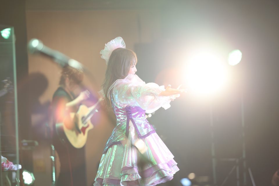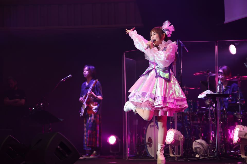 バンドメンバーに続いて、“ラプンツェル”のようなオーロラピンクの煌びやかな衣装でステージに現れたしょこたん。登場を待ち望んだファンから黄色い声があがると、「souffle secret」「せーので恋しちゃえ」からライブスタート。「甘いスイートソングたちを集めた」という昼公演らしく、会場をスイートな空気で包み込んだ。