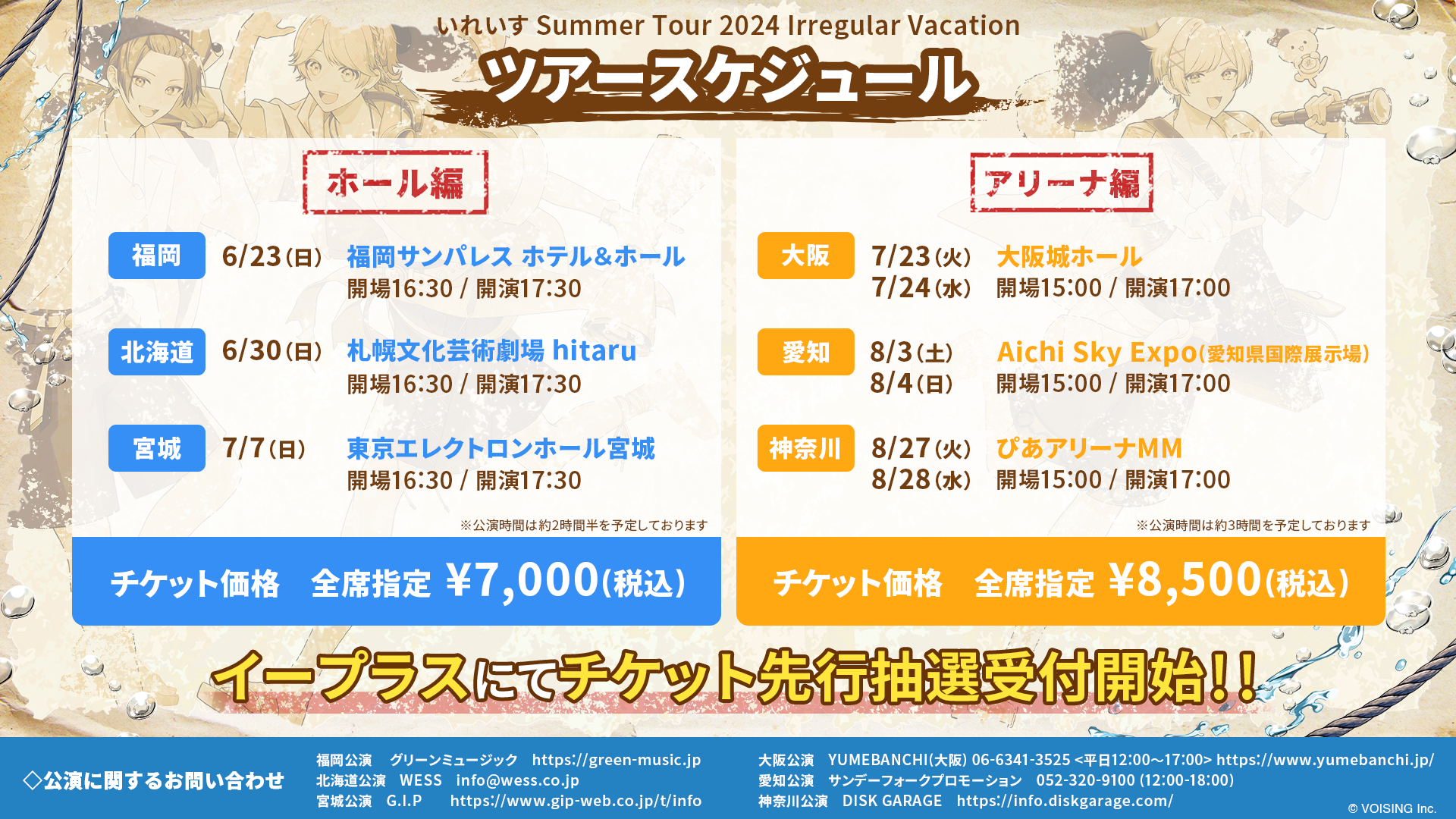 『いれいす Summer Tour 2024 Irregular Vacation』は、6月23日の福岡(福岡サンパレスホテル&ホール)公演を皮切りにスタートし、6月30日北海道(札幌文化芸術劇場hitaru)、7月7日宮城(東京エレクトロンホール宮城)、7月23日、24日大阪(大阪城ホール)、8月3日、4日愛知(Aichi Sky Expo(愛知国際展示場))、8月27日、28日神奈川(ぴあアリーナMM)と6都市9公演での開催となる。