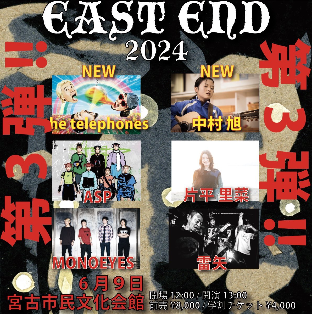 『EAST END』は、本州最東端の街・岩手県宮古市で開催される音楽イベントで、『POWER STOCK IN MIYAKO 2011』から13年、『EAST END』としての新たな船出となる。今年は、ASP、片平里菜、MONOEYES、雷矢の出演が発表されていた。