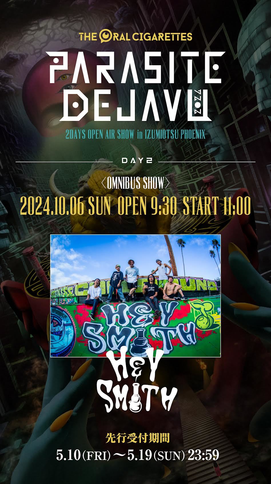 THE ORAL CIGARETTESが、10月5日(土)・6日(日)に大阪・泉大津フェニックスにて『PARASITE DEJAVU 2024 〜2DAYS OPEN AIR SHOW in IZUMIOTSU PHOENIX〜』を開催する。DAY2はオムニバス形式のイベントとして開催され、第1弾出演者としてHEY-SMITHの出演が発表された。