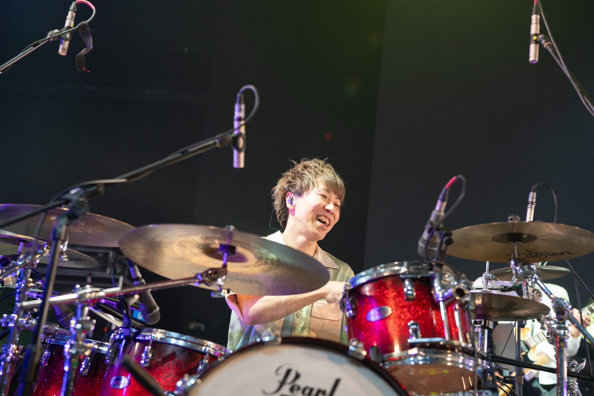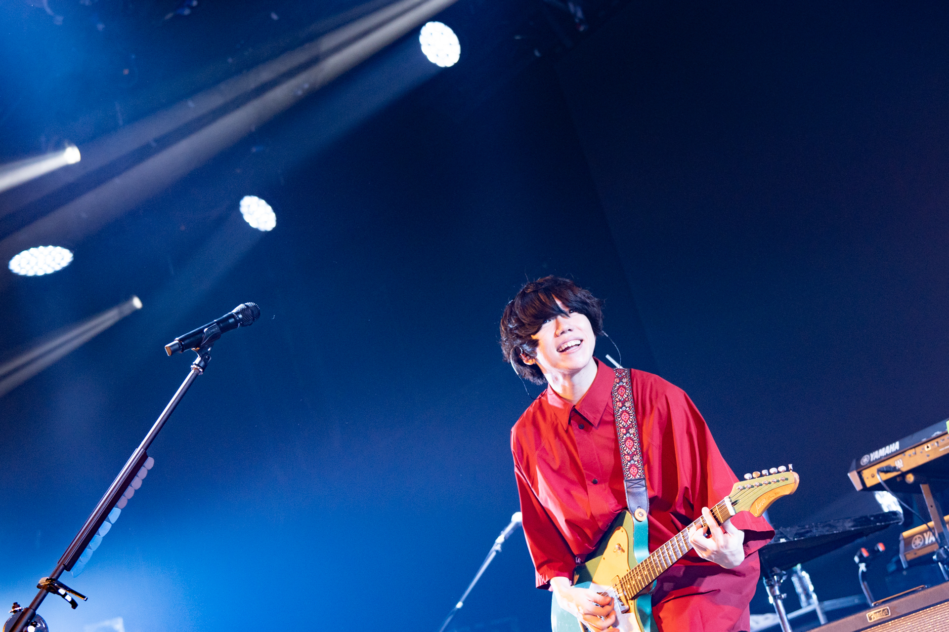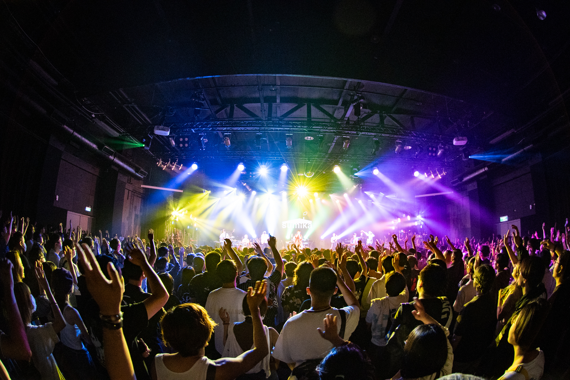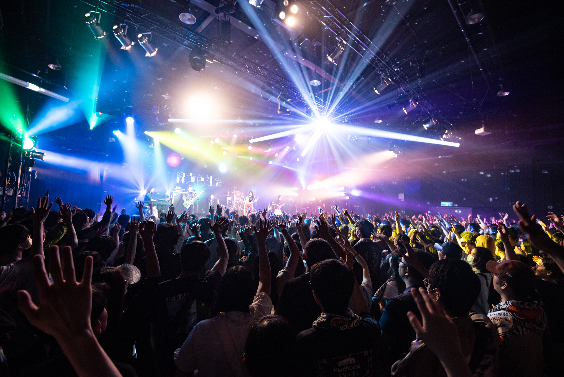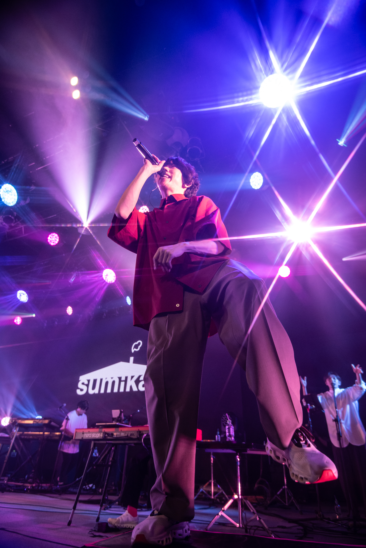 本公演のトップはsumikaの「大家好(こんにちは)、sumika!」という一声からスタート。「フィクション」から早速手拍子で会場全体を巻き込み、そのまま歓声が上がる中「ファンファーレ」へ。3曲目「ふっかつのじゅもん」は片岡(Vo.Gt)、小川(Key)のツインボーカルで疾走感溢れるナンバーで序盤からますます勢いが増していく。「sumikaにとって初の海外ライブ。大好きなバンドPenthouse、緑黄色社会と一緒にここに来ることが出来て嬉しい」と片岡が思いをいっぱいに語った。MC後にはアニメ『ダンジョン飯』のテーマ曲としても人気を博している新曲「運命」。軽快なリズムで一気に会場を虜に。