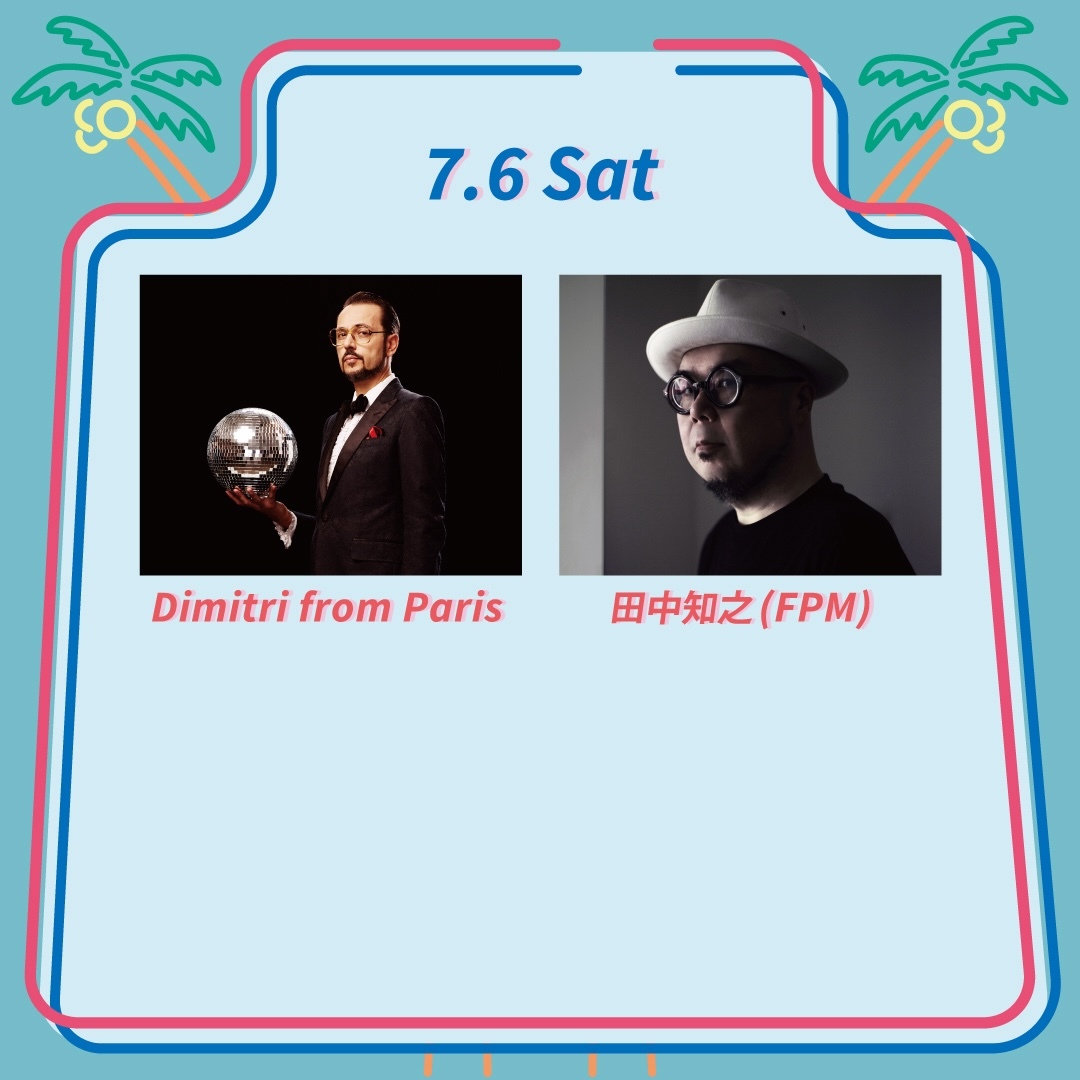 初日・7月6日(土)には、 世界中のクラブやフェスなどでプレイし、ダンス・ミュージック・シーンを牽引するDimitri from Paris、音楽プロデューサー/選曲家として国内外で活躍する田中知之(FPM)の出演が決定。