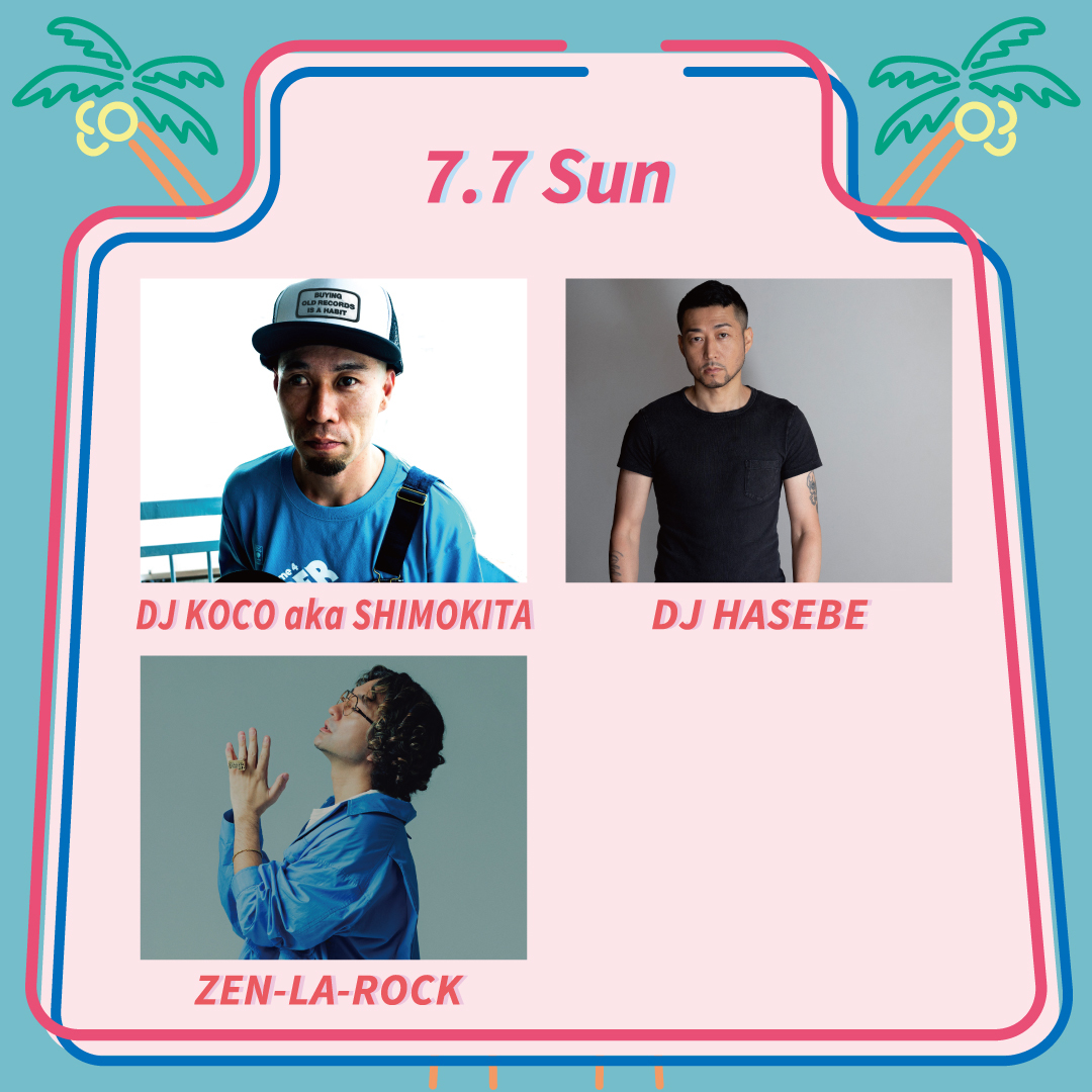2日目・7月7日(日)には、7インチレコードを使用した唯一無二のDJプレイが世界中から注目を集めるヒップホップDJ KOCO aka SHIMOKITA、アーティストのリミックやプロデュースを手がけるなど幅広い世代から絶大な人気を誇るDJ HASEBE、ラッパー・DJ活動と多岐に渡りROCKをし続けるZEN-LA-ROCKの出演が決定した。