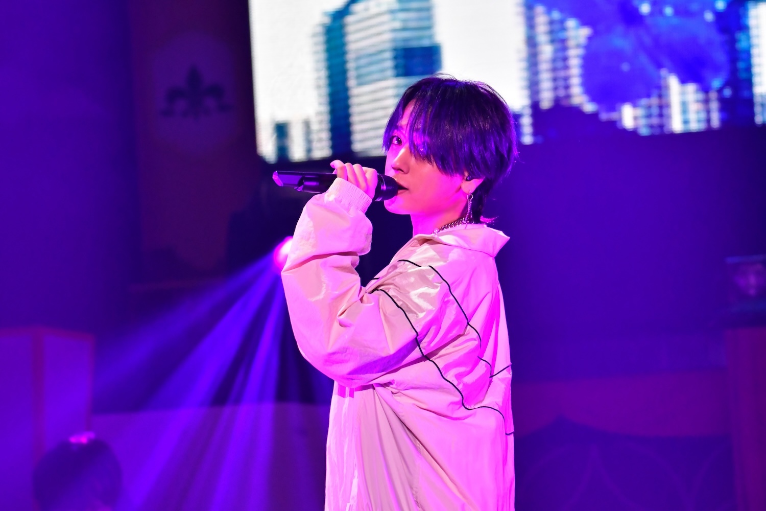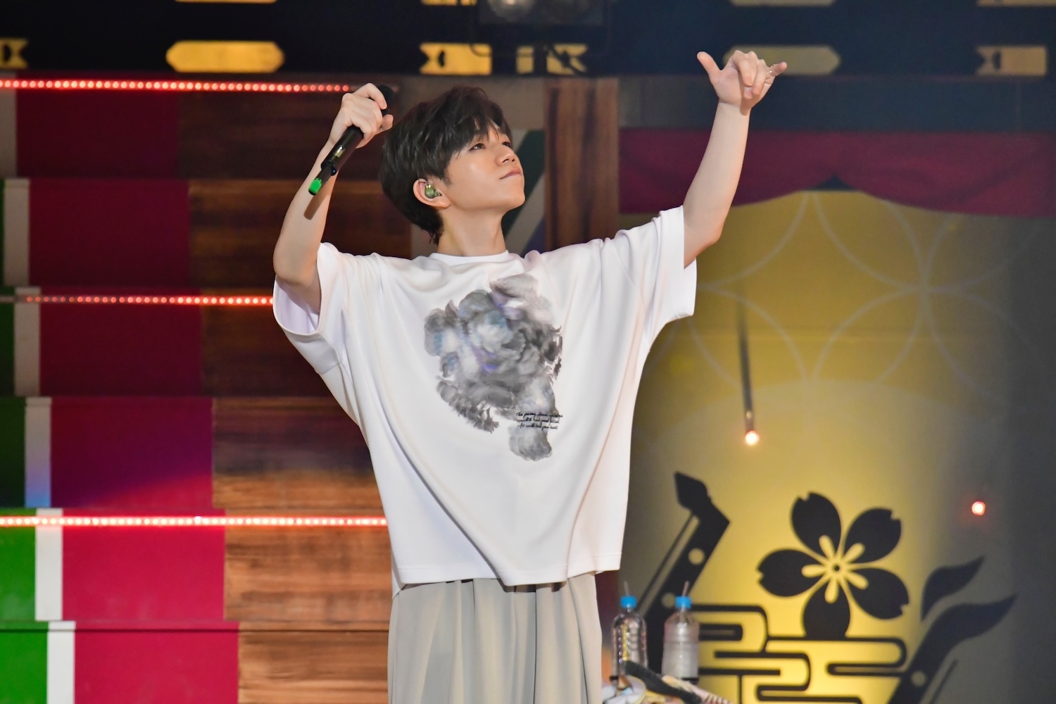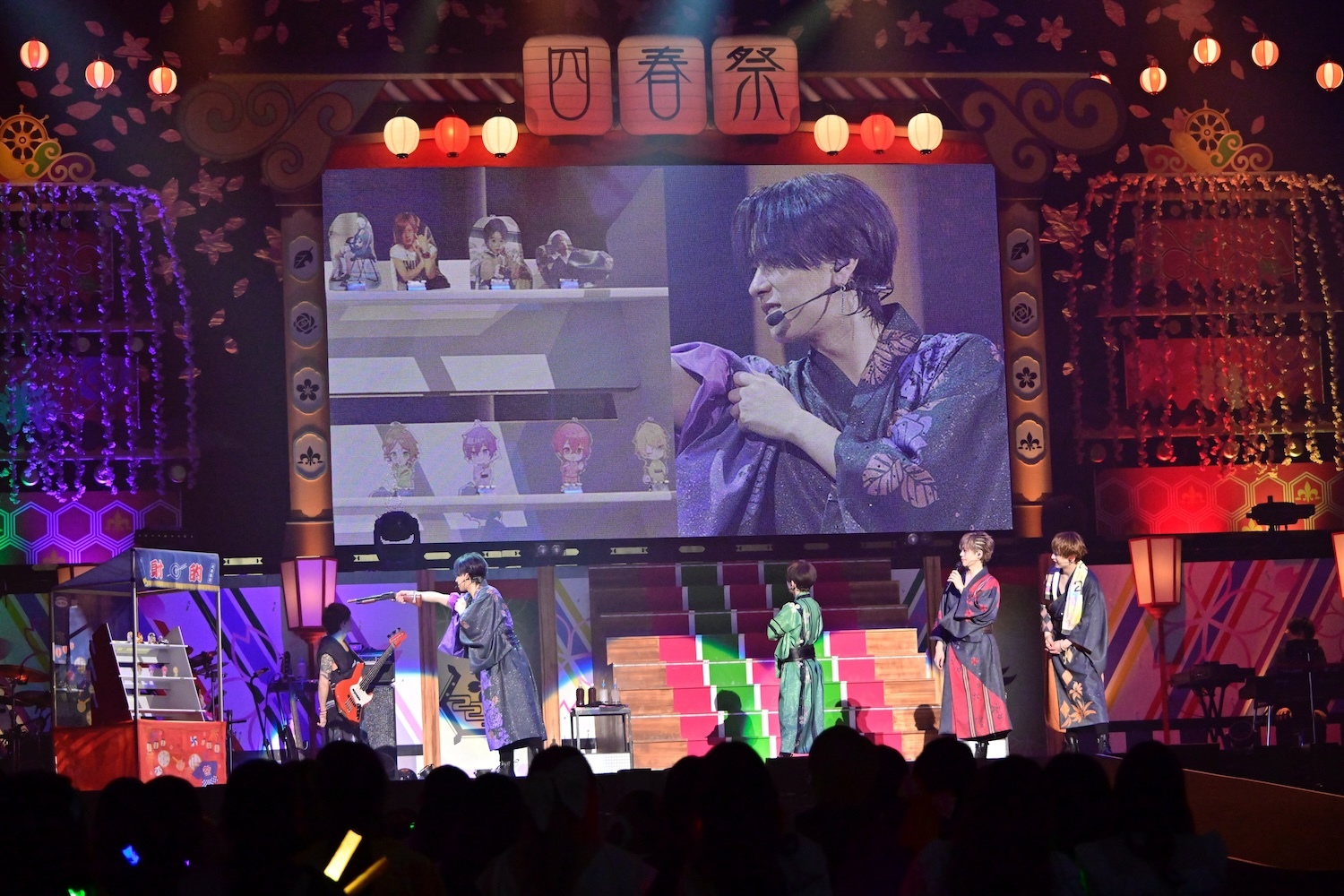 動画上映が終わると、カジュアルな衣装に着替えた彼らが再登場。「鈍色Wheels」、「シャドウ」など、アッパーチューンであっという間に会場をライブモードへ引き戻した。さらに、後半ブロック前には各メンバーのソロコーナーが用意され、一番手にうらたぬきが登場し、「だれかの心臓になれたなら」を熱唱。客席はグリーンのペンライトで埋め尽くされた。心に響く切ない歌詞を情感豊かに歌ったうらたぬきの目には光るものが……。次はとなりの坂田。の「ロスタイムメモリー」。もちろん、場内は赤色に染まる。やんちゃなキャラの彼らしく、熱いパフォーマンスでcrewの声援に応えた。3番目はセンラ。イエローのペンライトが揺れる中、彼が歌ったのは「さよならメモリーズ」。春の別れを綴った曲だが、センラは艶っぽく歌い上げた。ソロコーナーのトリには志麻が登場。彼は多くの歌い手に愛されている人気曲の「バレリーコ」をチョイス。紫のペンライトを掲げた観客は“エッサホイサ!”のコールでブチ上がり、後半戦への起爆剤となった。