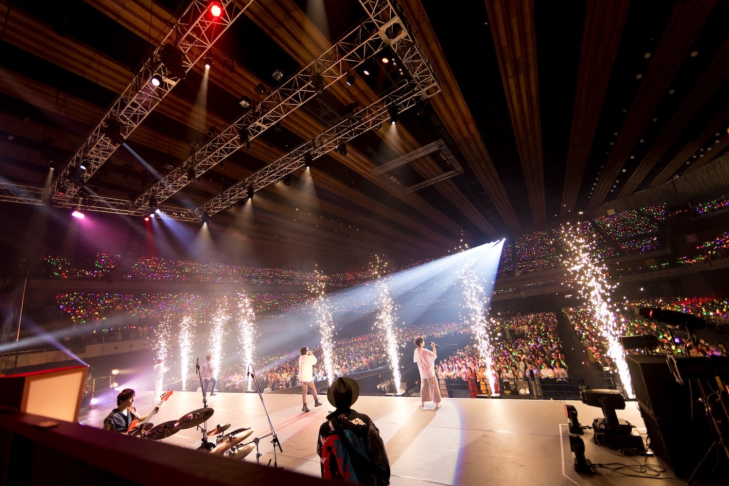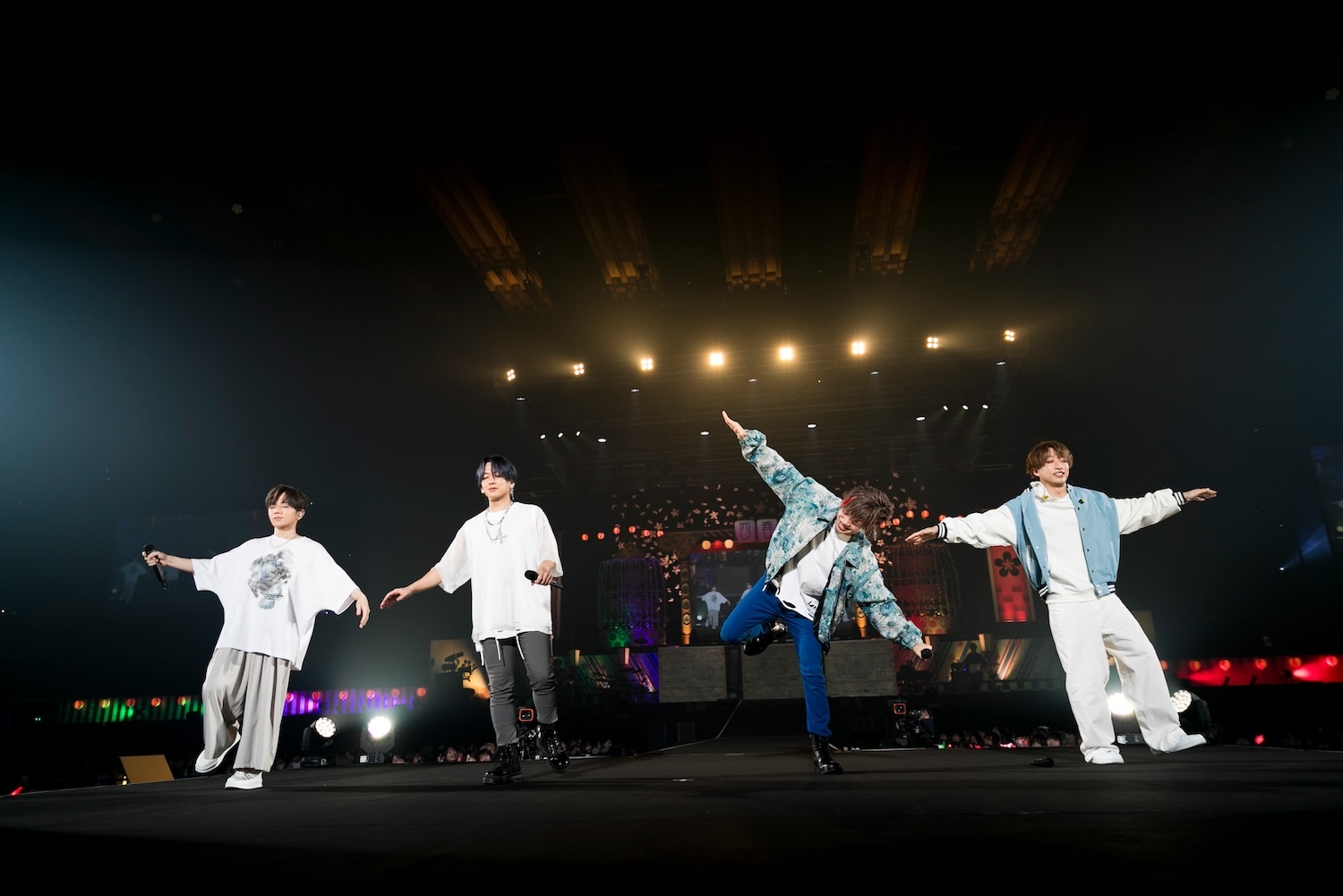 ソロコーナー後に再び4人が集結すると、バイラルヒットとなったCreepy Nutsの「Bing-Bang-Bang-Born」を投下。盛り上げどころを熟知した選曲はさすがのひと言だ。最終ブロック前にはツアーを振り返り、軽快なMCでエピソードを語ってくれた彼ら。そこで、となりの坂田。が飛行機に乗り遅れるという衝撃の事件(!)を暴露される。また、crewの願いごとが書かれた絵馬がズラリと並んだボードがステージに運ばれ、いくつかを読み上げて話題を広げ、トークでも楽しませてくれた。