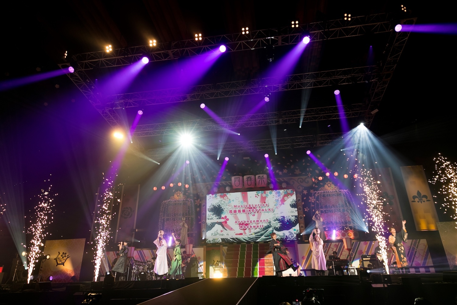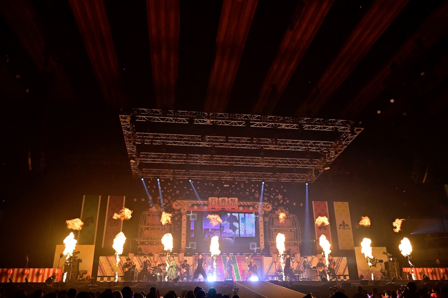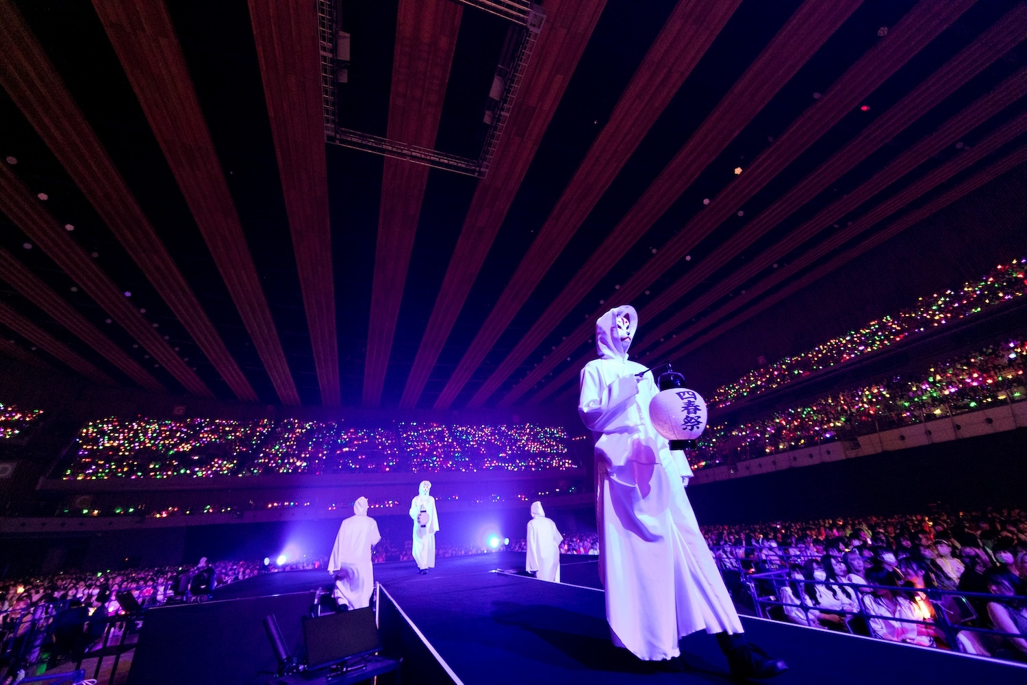 会場はメインステージ中央からアリーナの客席中央に花道が延び、センターステージが設置されるという、広い会場ならではのセッティング。客席が埋まり、開演時間を迎えると、場内の照明がゆっくり落ちていく。ふと周囲を見ると、アリーナやスタンド席の通路にキツネのお面をつけ、フードをかぶり、全身をすっぽり覆った服の人が何人も練り歩いているではないか。提灯を持った人もいて、まるでキツネの嫁入りのような光景だ。ややホラー風味すら感じながらも、観客は非現実の世界に引き込まれていく。鐘の音を合図に、キツネ面の人々がステージに上がり、何名かは踊り始める。その後、いったんソデに引っ込んだかと思うと、再度ステージにキツネ面の人々が現れ(ここで多くの観客も、ひょっとしてこの中に……と気づく)、続いてひとりずつお面とマントを脱いでいくと、うらたぬき、志麻、となりの坂田。、センラが華麗に姿を見せるというオープニング! 観客の大歓声が一気にフルボリュームとなり、同時にメンバーカラーの緑(うらたぬき)、紫(志麻)、赤(となりの坂田。)、黄色(センラ)のペンライトが激しく揺れ始めた。