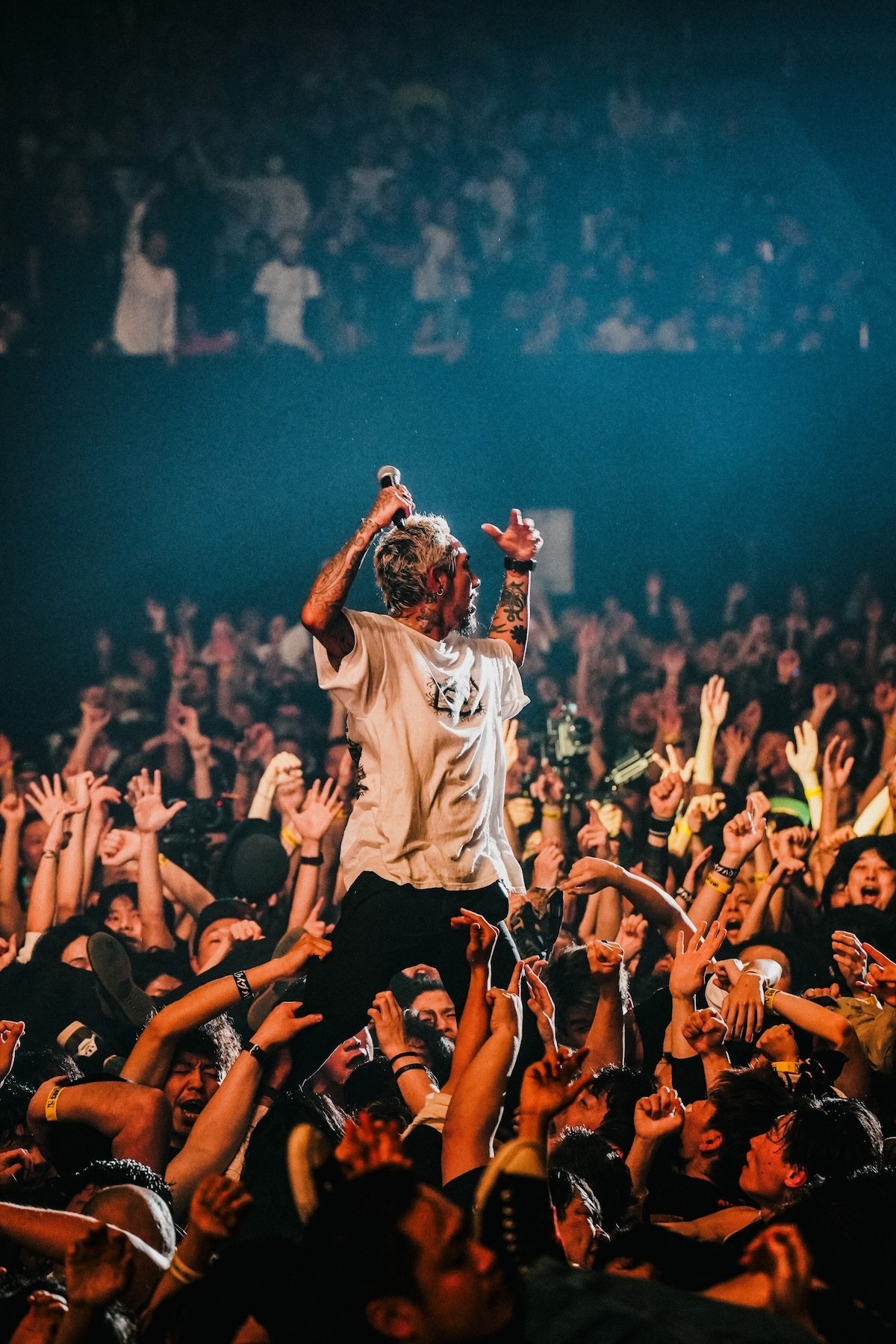 「俺らがこの日をどんだけ待ったか・・・一つのバンドが夢を叶える瞬間を観てください!」とJESSEは語りかけ、「Numb」では観客も両手を上げて大騒ぎ。その熱気を「Louder」がより一層膨らましていった。気づけば、アリーナはモッシュ&ダイバーで溢れ返っているではないか。「Adam & Eve」においてはJESSE自らアリーナに突入して「エブリバディ、セイ!」と内側から焚きつけ、濃密なコール&レスポンスを繰り広げる有様だ。そして、The BONEZ“songs medley”(「Rude Boy」〜「Moves」〜「Breath」〜「Revolution」〜「Rude Boy」)に移り、熱狂の渦を高めた後、少し長めのMCタイムへ。