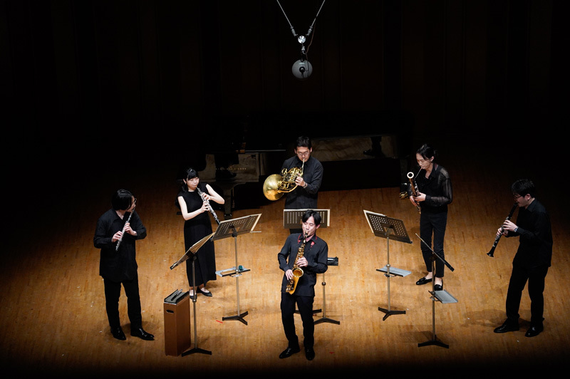 そして、ここからが “with アンサンブル” スペシャルコンサートの本領発揮。次なる ミヨー「スカラムーシュ」では、通常ピアノとの共演で演奏されることが多いこの作品を、あえてクラリネット、ファゴット、ホルン、オーボエ、フルートという木管五重奏との共演で聴かせた。特に第一曲目のVifでは、アルトサックスを囲んで、木管、金管という、いわゆる(サックスの)同族楽器たちが繰り広げる洒脱な会話が不思議と聴き手の想像力を掻き立てる。会場の聴衆もこの作品の魅力を数倍楽しんだことだろう。