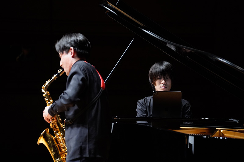 舞台上の12人に惜しみない拍手が贈られた後、アンコールの一曲を演奏。再びピアノの高橋とともに、近年、(上野に)献呈されたという唯一無二の作品を本日初めてソプラノサックスで演奏した。