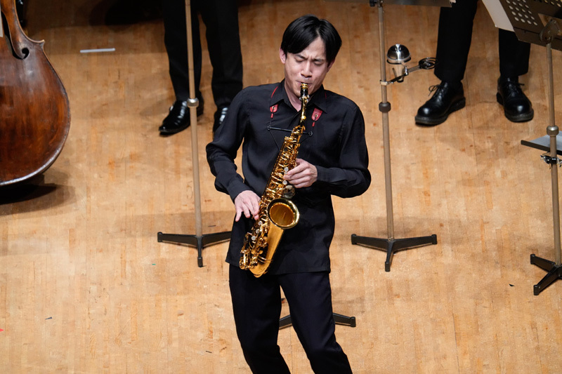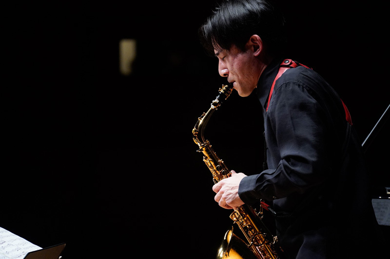 当作品はサックス奏者にとって、オーディションやコンクールで必ず課題曲や勝負曲として扱われる作品だけに、実は上野自身にとってもあまり良い思い出がないそうで、「だからこそ、この作品の真価を導き出せることをよりいっそうやってみたかった」という。それだけに上野率いるアンサンブルの意気込みが冒頭から伝わってきた。アルバン・ベルクの室内管弦楽曲を思わせる音の厚みと密度の濃い色彩に加え、まさに一人ひとりが主役と感じさせるオーケストレーションの妙で客席を圧倒。魅惑的な音の渦の中で奏でられる上野の音の安定感もまた格別だ。