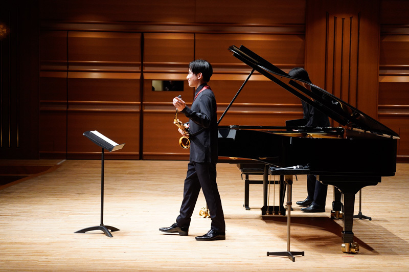 プログラム第一部——相思相愛のパートナーであるピアニストの高橋優介とのデュオで聴かせた前半第一曲目は、プラネル「プレリュードとサルタレロ」。数分の小曲だが、早くも上野が紡ぎだすムーディな旋律があたたかく空間を包み込む。紀尾井ホールが誇る繊細で豊麗な音響空間を最大限に生かし、深くゆったりとブレスを取りながら伸び伸びと歌い上げる上野の音に、客席も瞑想的空間に引き込まれるような感覚を覚えたことだろう。ちなみに前半4曲はすべてアルトサックスによる演奏だ。