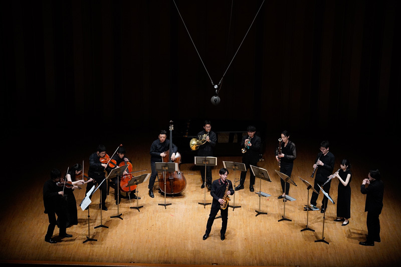 本プログラム最後を飾るのは、イベールの代表作「アルト・サクソフォンと11の楽器のための室内小協奏曲」。当日、上野のために駆けつけた日本を代表する11人の各種弦・管楽器奏者たちがリアルにステージ上に登場し、それだけでも迫力があった。