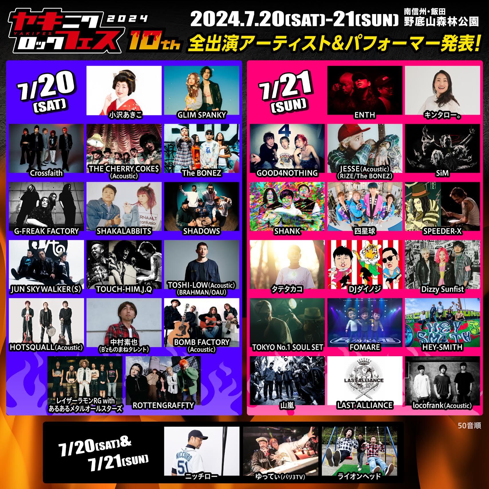 2024年7月20日(土)、21日(日)の2日間、長野県・飯田市野底山森林公園特設ステージで開催される音楽フェス『焼來肉ロックフェス2024』の全アーティストと日割りが発表された。