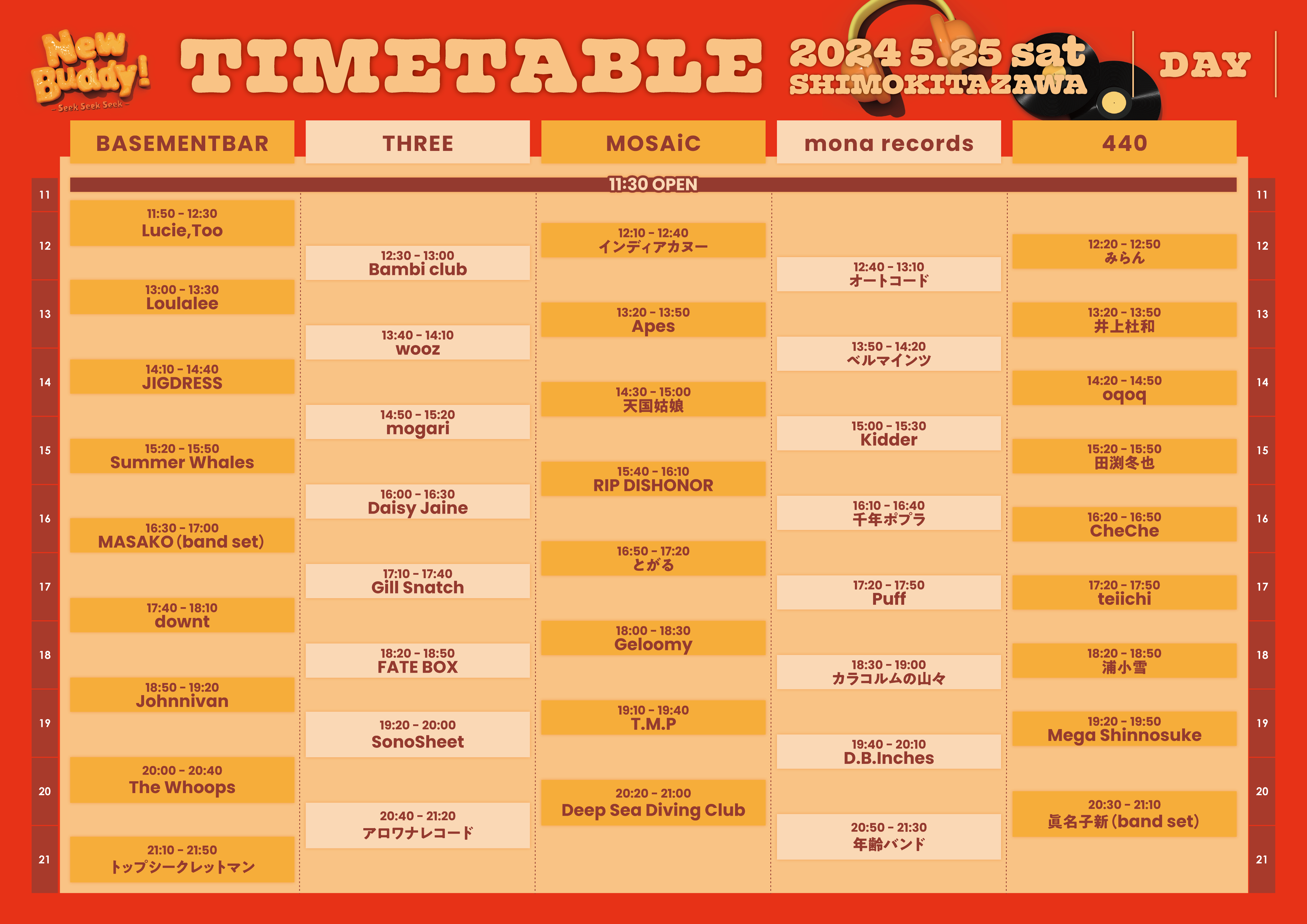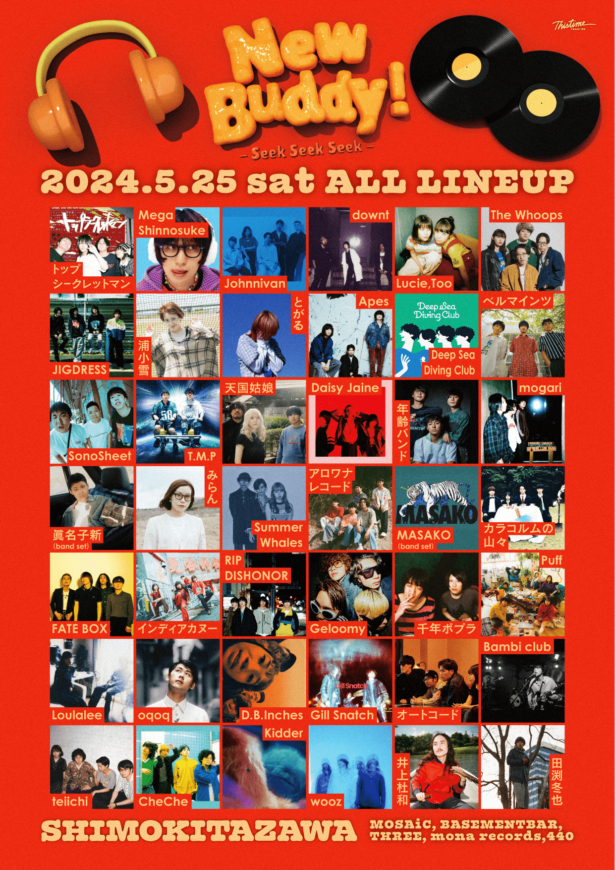 2024年5月25日(土)に下北沢5会場にて開催される『New Buddy! -Seek Seek Seek-』の最終アーティストとタイムテーブル、深夜公演が発表された。