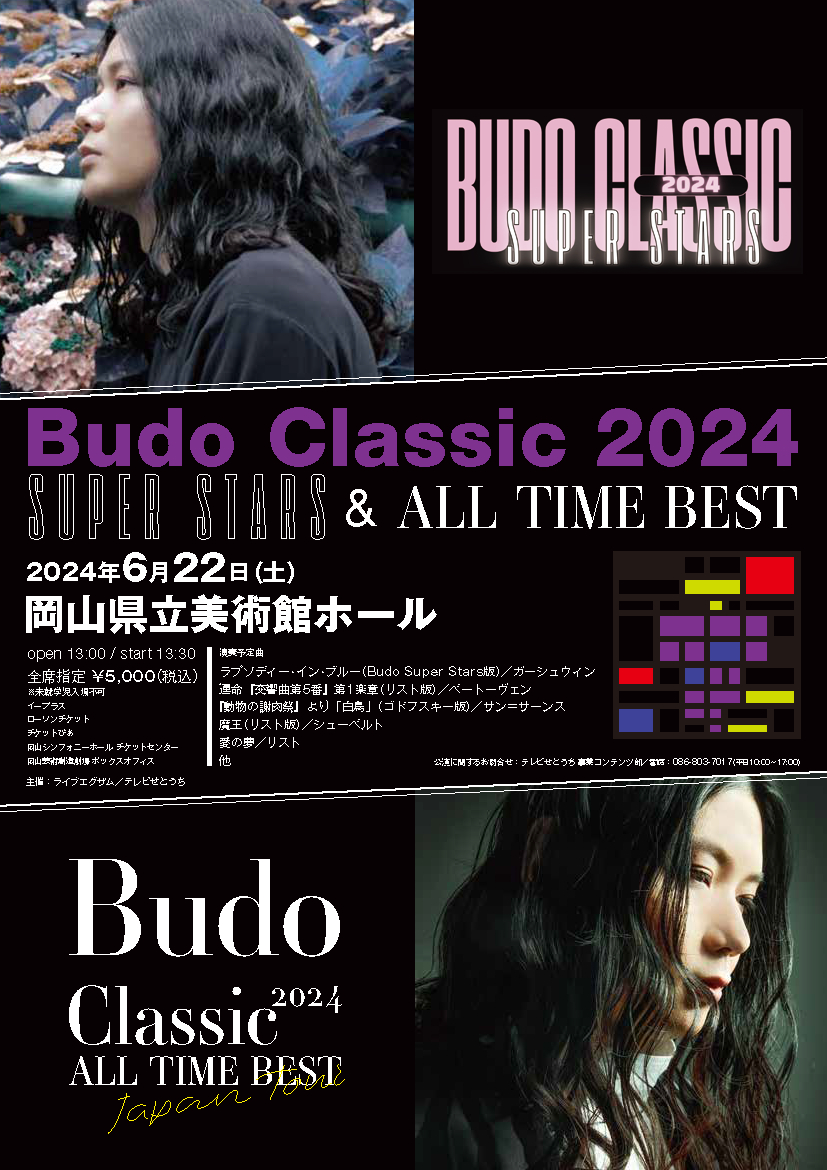 そんなBudoが、サントリー・ホールを前にして緊急発表したのが、6月22日(土)岡山県立美術館ホールでのコンサート『Budo Classic 2024 SUPER STARS&ALL TIME BEST』である。角野隼斗や石井琢磨など新進気鋭のピアニストたちのコンサートを岡山で成功させ続けている、テレビせとうちの要請でツアーに先駆けて東京・大阪以外では初めてのリサイタルとなる。