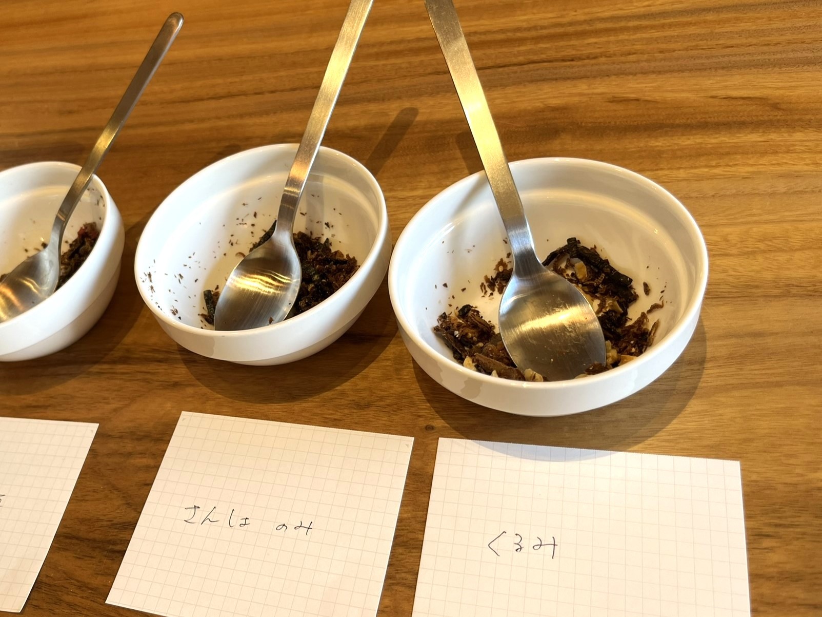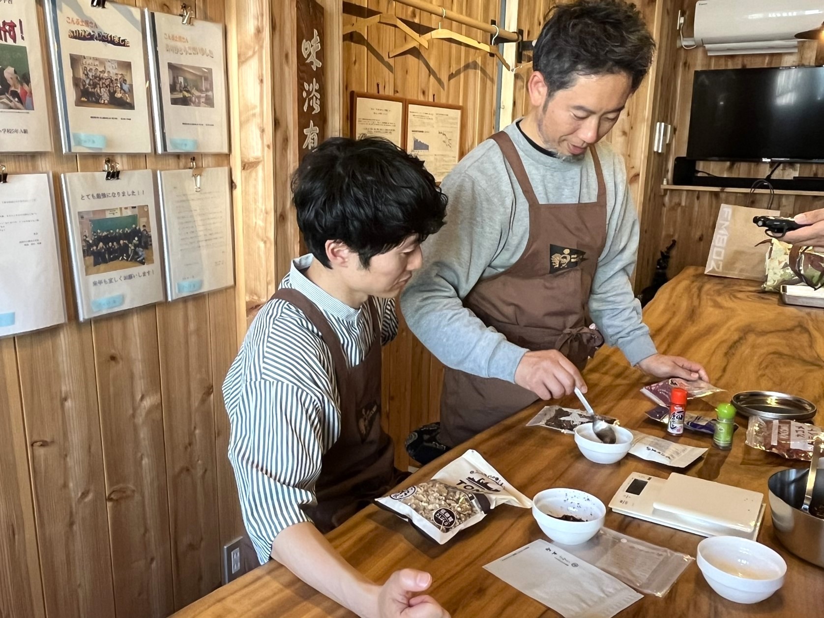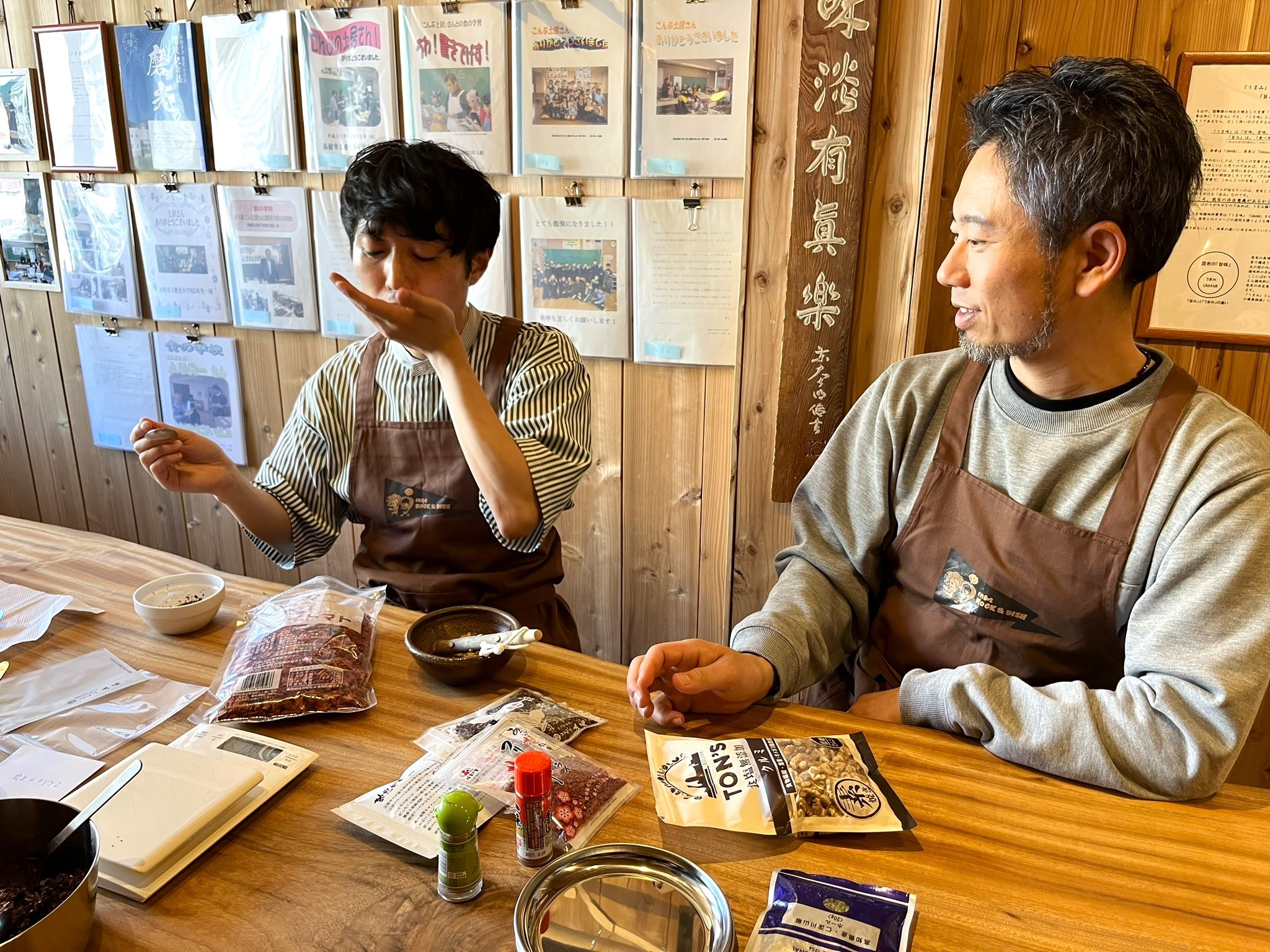 試行錯誤した結果、しっとりふりかけ+山椒、しっとりふりかけ+くるみの2つが最終候補となった。「面白いですね!均一に混ぜることができたら問題ないと思います」と土居さんも太鼓判!この日は、一旦持ち帰って、山椒とくるみの素材や仕入れ先を検討。後日土居さんに試作品を作っていただき、商品化へ進むこととなった。