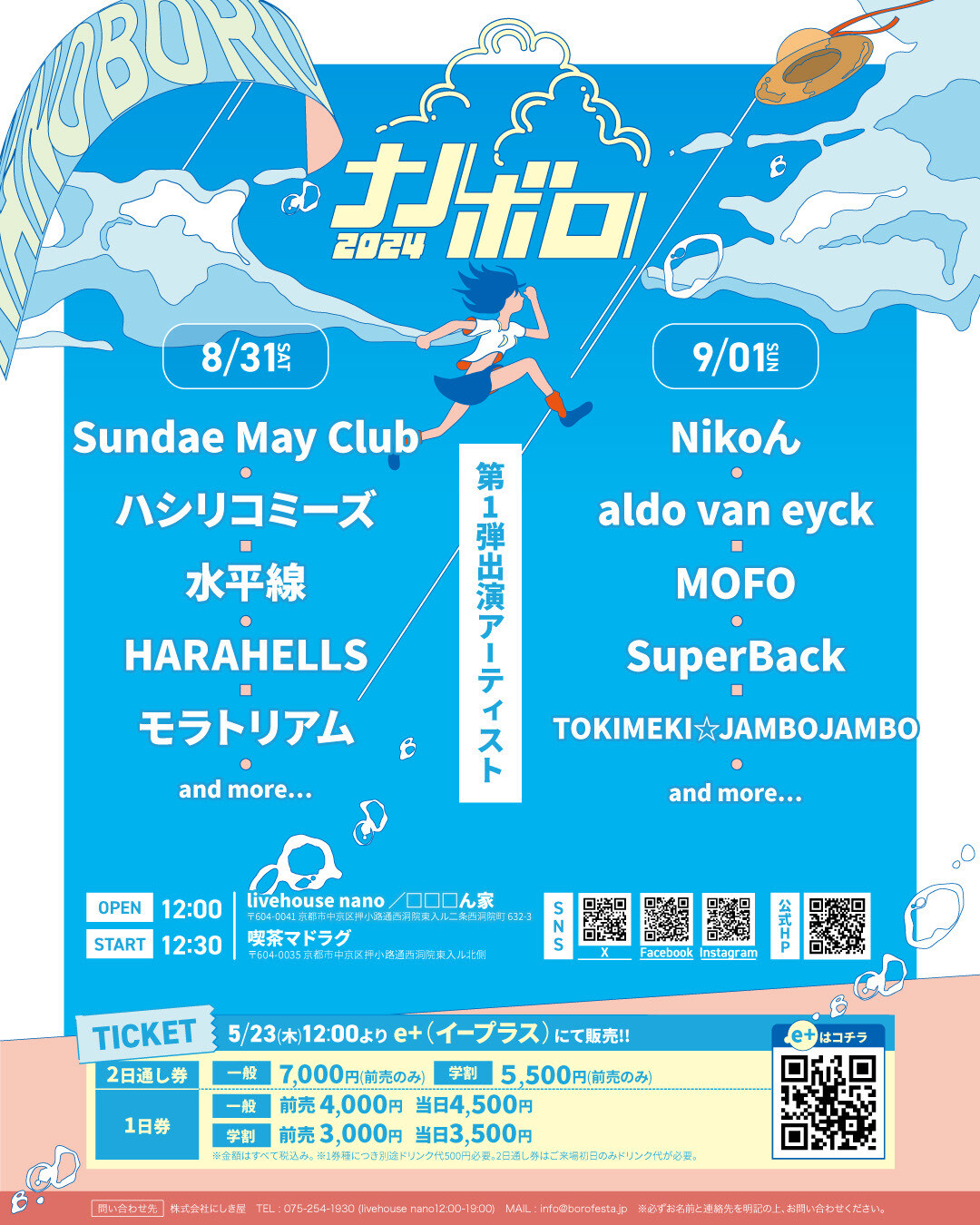 『ナノボロ2024』第1弾出演アーティストとして発表されたのは10組。8月31日(土)には、Sundae May Club、ハシリコミーズ、水平線、HARAHELLS、モラトリアムが出演。9月1日(日)には、Nikoん、aldo van eyck、MOFO、SuperBack、TOKIMEKI☆JAMBOJAMBOが出演する。