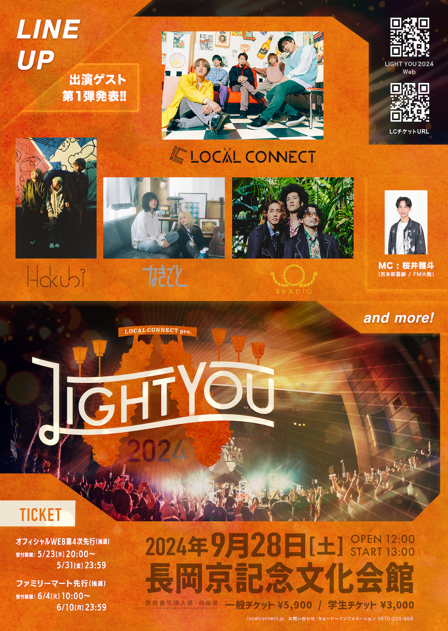 LOCAL CONNECTが、9月28日(土)に京都府長岡京記念文化会館にて開催するホールイベント『LIGHT YOU 2024』の第一弾出演アーティストとして、Hakubi、BRADIO、なきごとの出演を発表した。