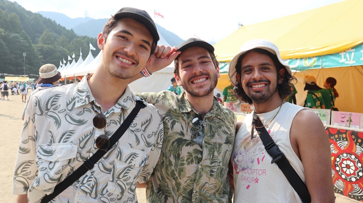 全員『フジロック』初参加のアシュリさん(28歳)とニコさん(27歳)とケンジさん(25歳)。今回お目当てのアーティストを尋ねると「LIZZO〜!」と大合唱。「人生初です」と目を輝かせるアシュリさんは、そのほかにも「never young beach、初めて観ました。3曲しか知らないですけど、フロントマンがめちゃくちゃカリスマがあって、すごい楽しいと思いました。夜はREDできゃりーぱみゅぱみゅ観ます。私たち外国人ですから、どちらかといえば洋楽のアーティストの方が知っているのでLIZZOもですけど、日本人のアーティストも楽しみです」とのこと。ケンジさんは「いろんなステージ回って、こういうアーティストがいるんだなって観ながら楽しんでます。あと、GINGER ROOT観ます。明日仕事ですけど(笑)」と夜まで楽しむことを宣言。