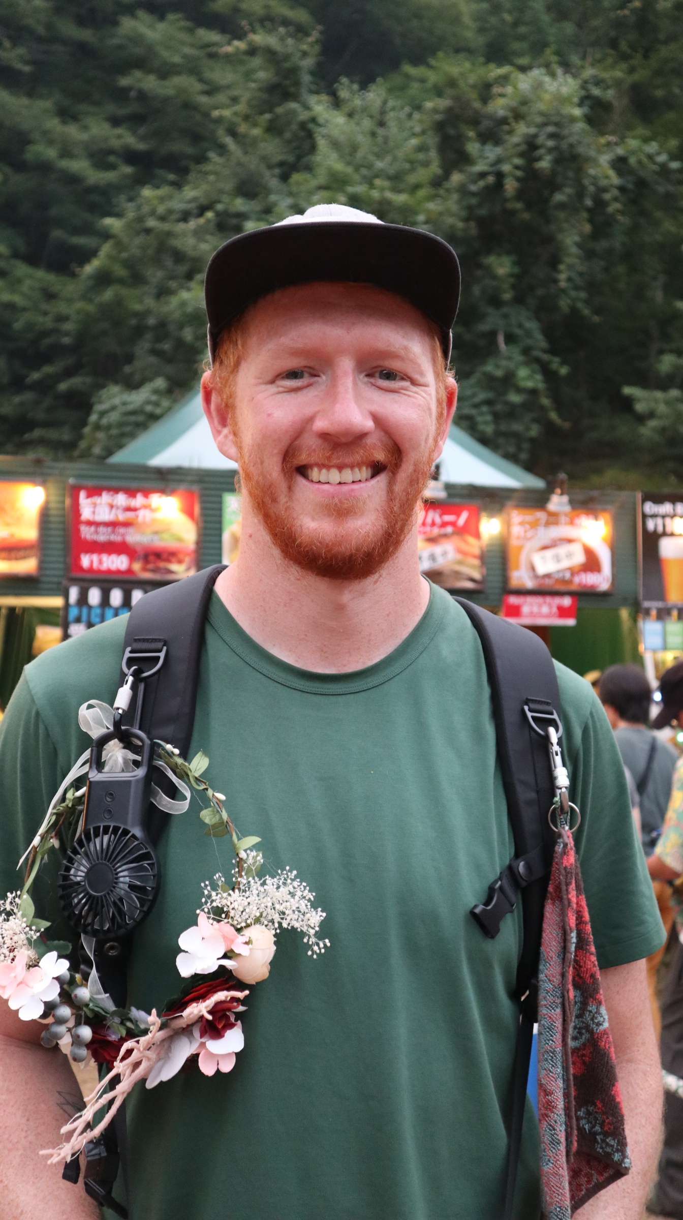 「目当てのアーティストは、FOO FIGHTERSとWEEZER。歩きながら観たいものを探しています」と語るベンジャミンさんは、ドイツの『Rock Am Ring』などヨーロッパのフェスに行ったことがあるそうで、「『フジロック』は山の中で開催されているのがヨーロッパのフェスとの大きな違い。とても良くオーガナイズされているところや、参加者がサスティナブルな傾向にあるのもいいですよね。リサイクルとか、その辺の意識がヨーロッパとは大きく違いますね」と他国との違いについて語ってくれました。